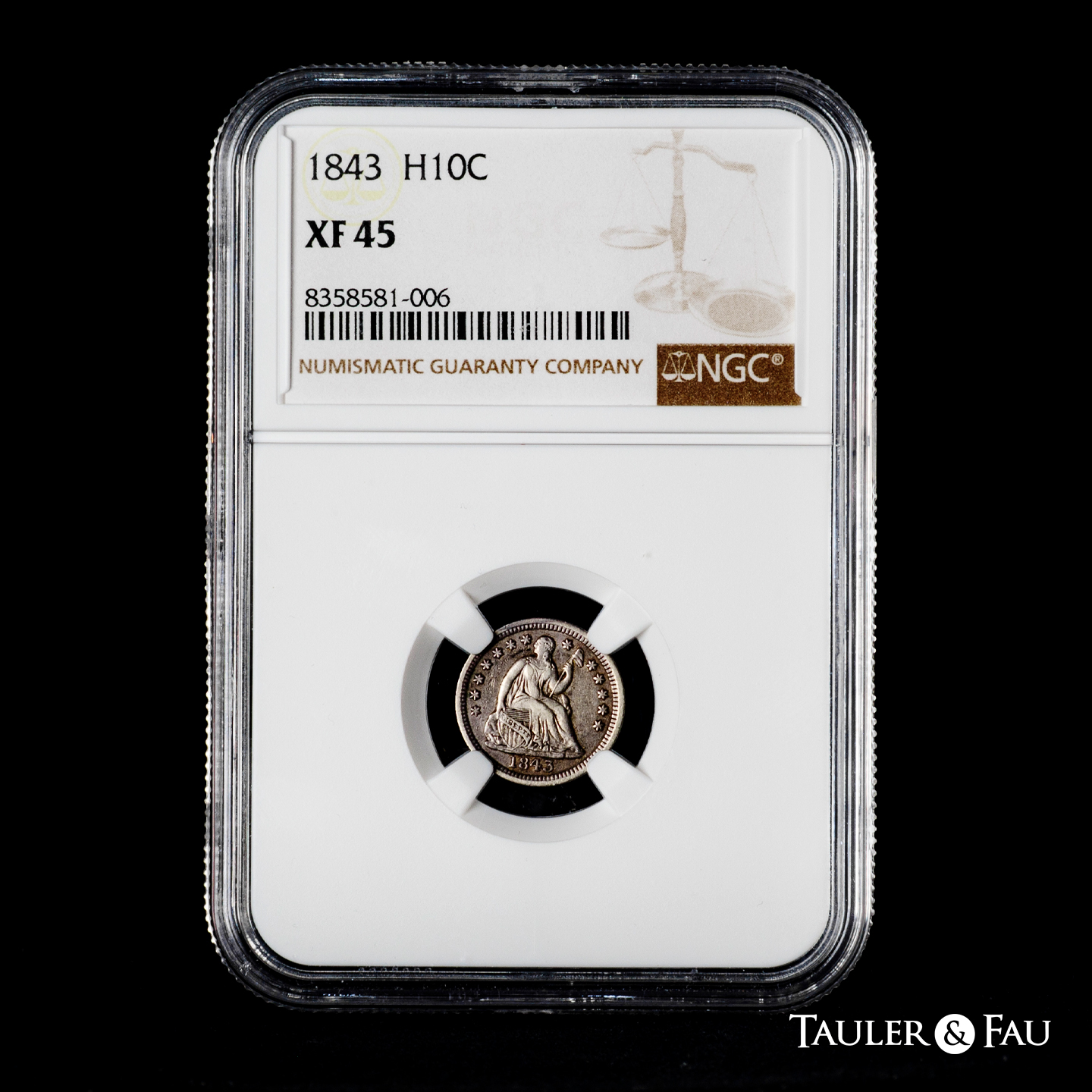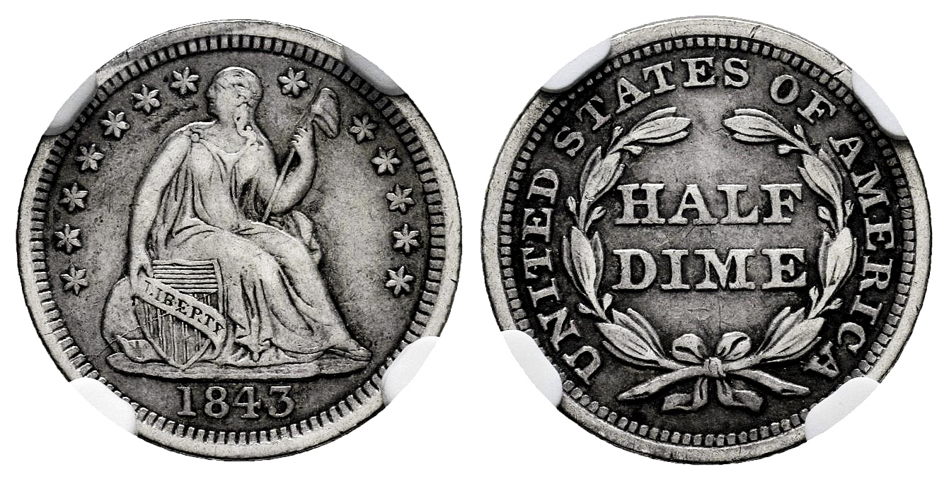 U.S. Coins. Seated Liberty Dime. 1 dime. 1843. Philadelphia. (Km-63.2). Ag. Slabbed by NGC as XF 45. Est...100,00.