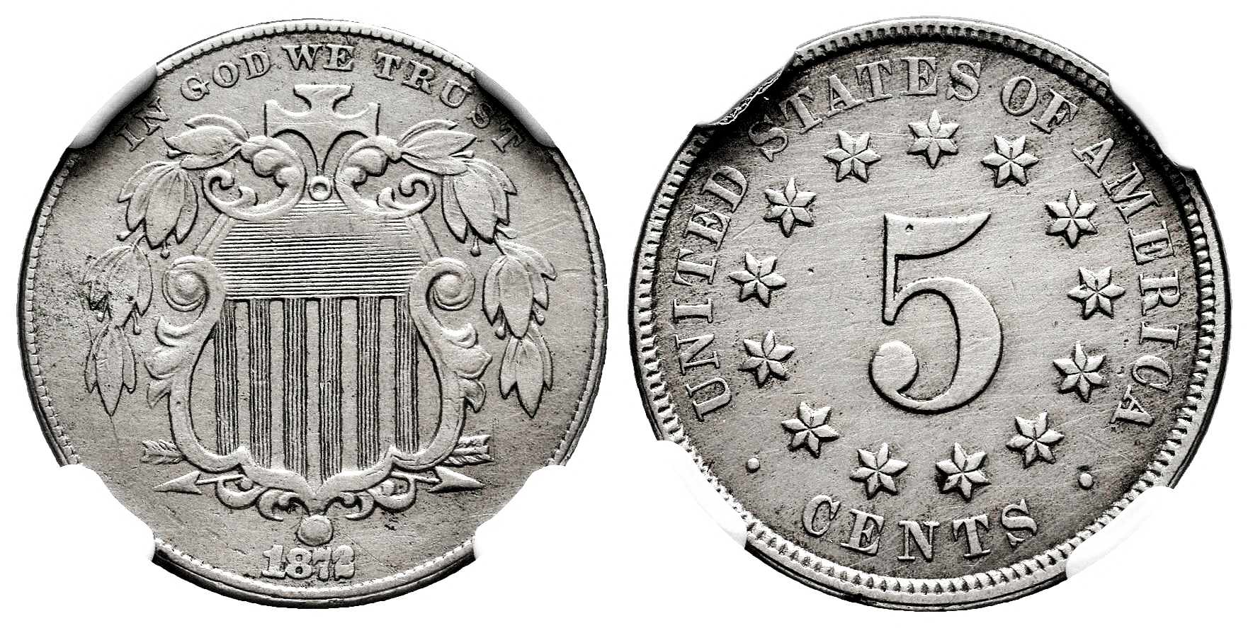 U.S. Coins. Shield Nickels. 5 cents. 1872. Philadelphia. (Km-97). Ni. Slabbed by NGC as AU Details, Cleaned. Est...60,00.