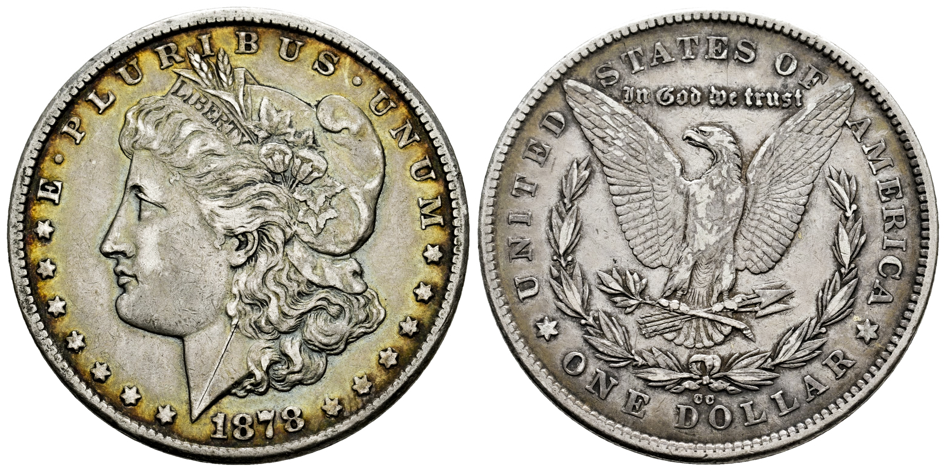 U.S. Coins. Morgan Dollars. 1 dollar. 1878. Carson City. CC. (Km-110). Ag. 26,63 g. Slightly iridescent patina on obverse. Scratch on obverse. Scarce. Choice VF/VF. Est...150,00.
