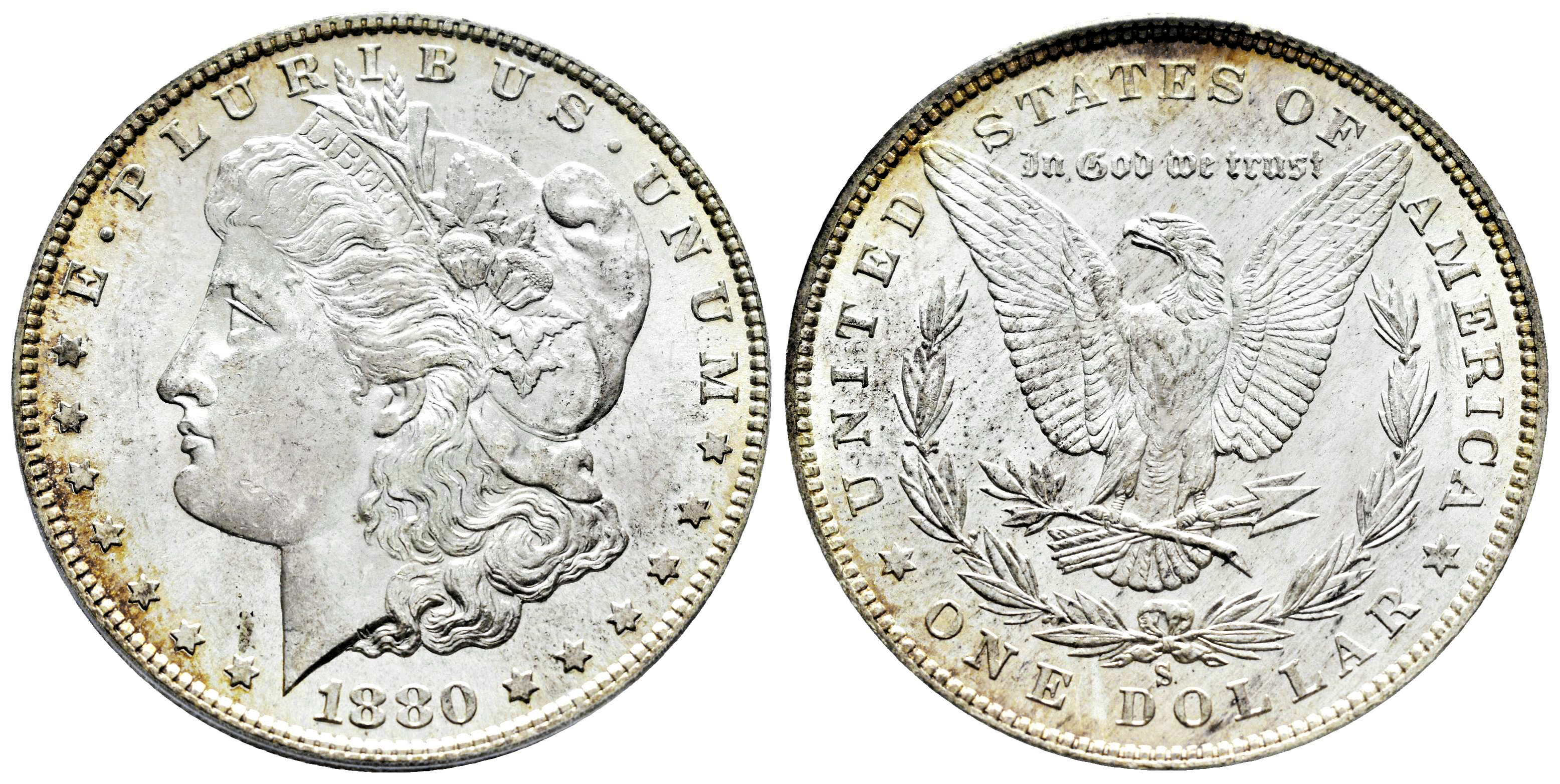 U.S. Coins. Morgan Dollars. 1 dollar. 1880. San Francisco. S. (Km-110). Ag. Slabbed by PCGS as MS 63. Lightly toned. Original luster. Est...110,00.