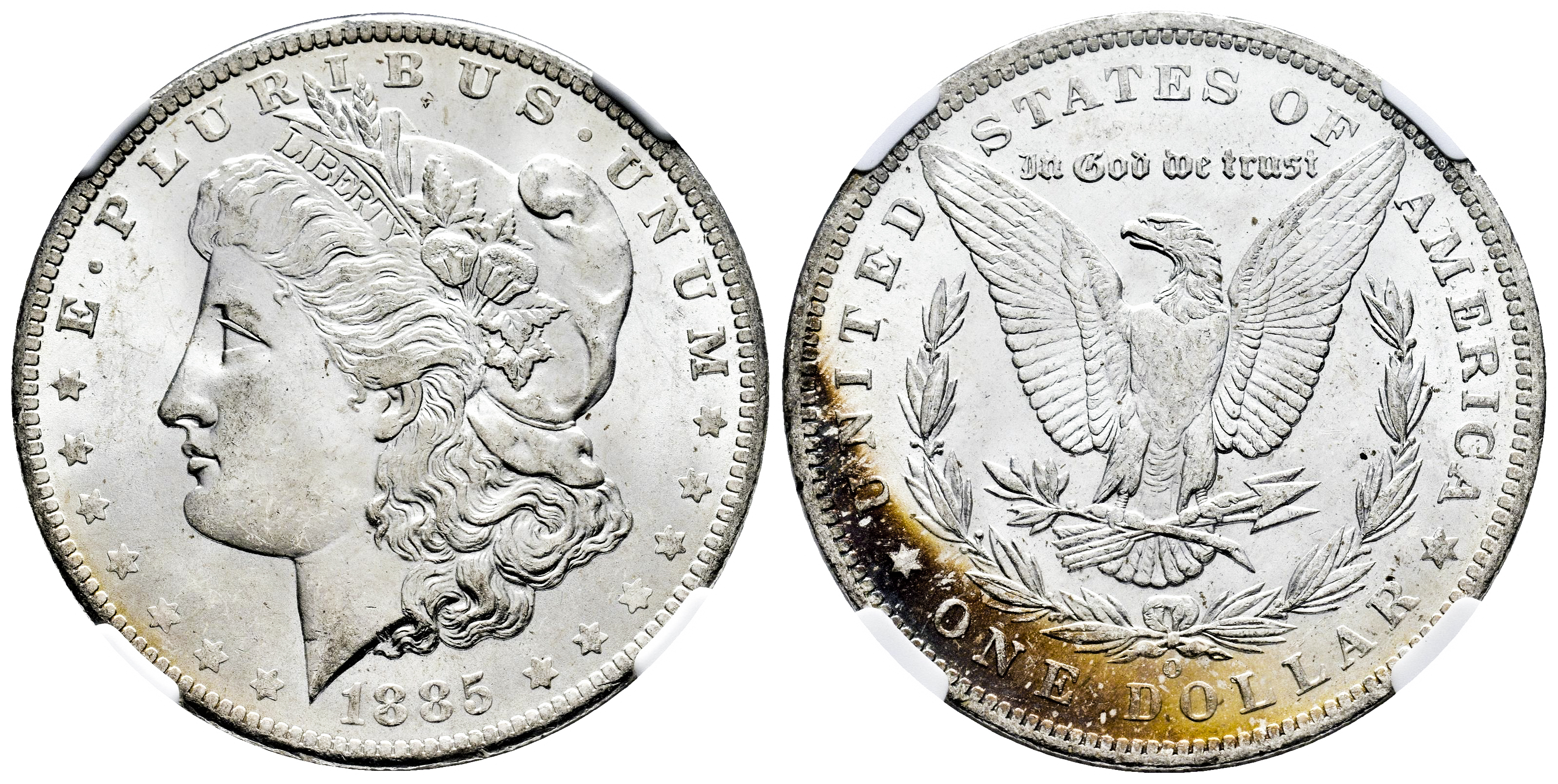U.S. Coins. Morgan Dollars. 1 dollar. 1885. New Orleans. O. (Km-110). Ag. Plenty of original luster. Slight tone in reverse. Slabbed by NGC as MS 63. Est...150,00.