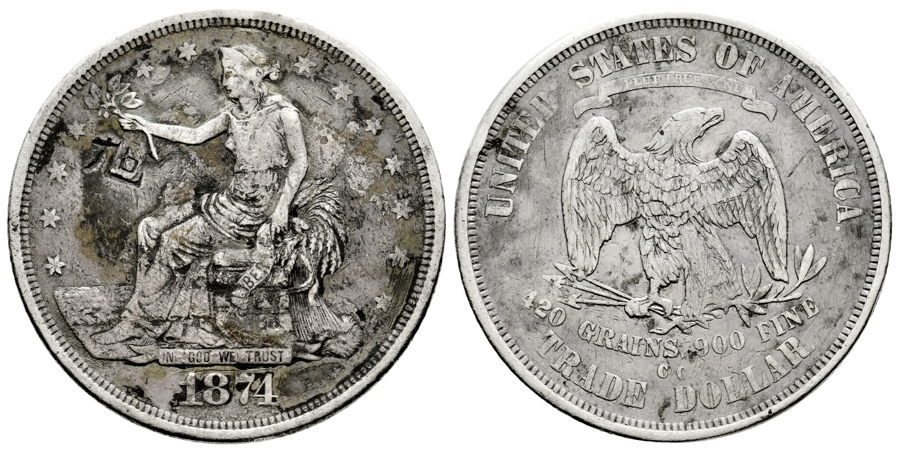 United States. Trade dollar. 1874. Carson City. CC. (Km-108). Ag. 26,95 g. Chop mark. Irregular patina. Almost VF. Est...200,00.