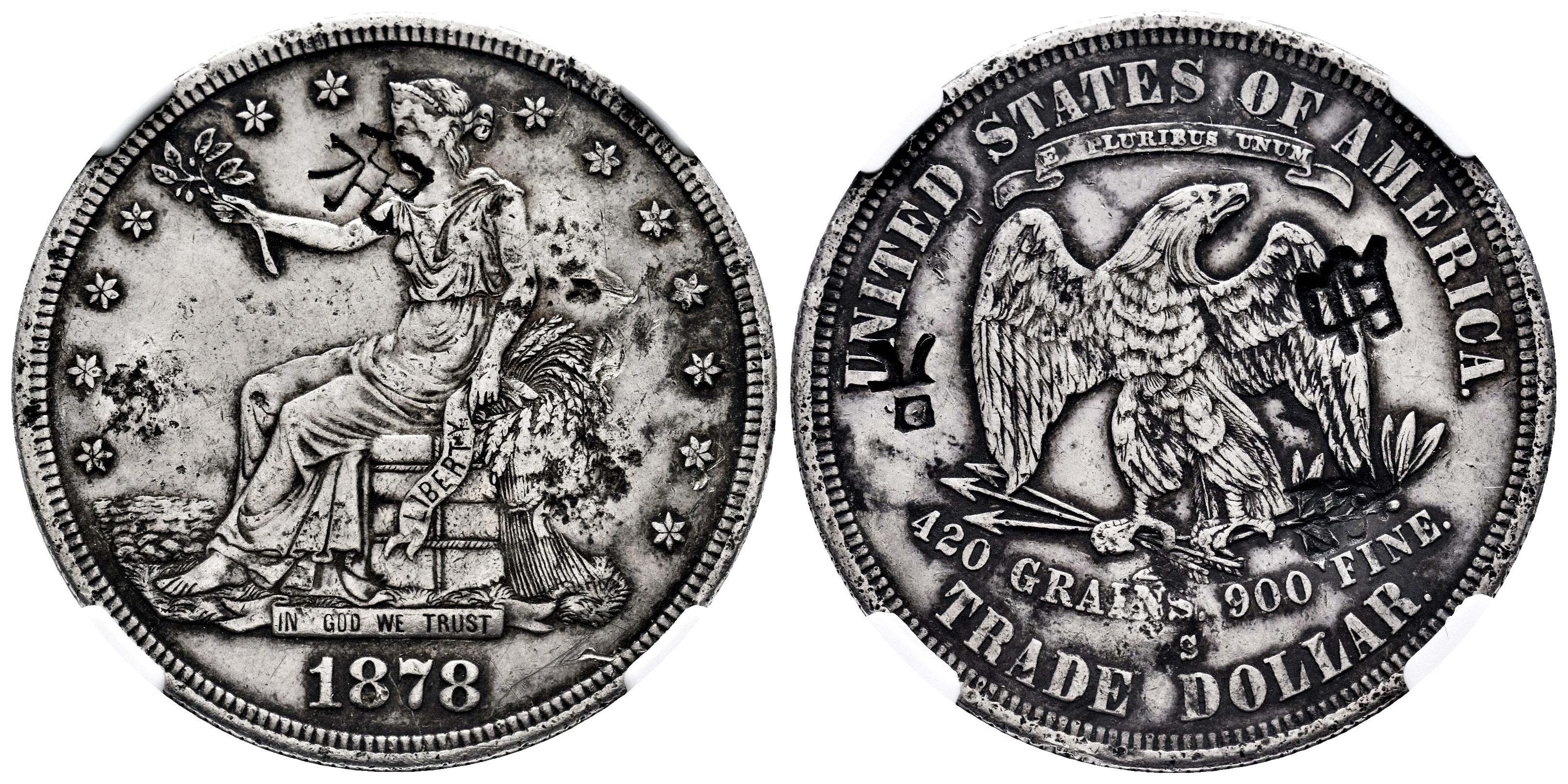 United States. Trade dollar. 1878. San Francisco. S. (Km-108 var.). Ag. 27,23 g. Chopmarked. Slabbed by NGC as XF DETAILS, CHOPMARKED. Est...180,00.