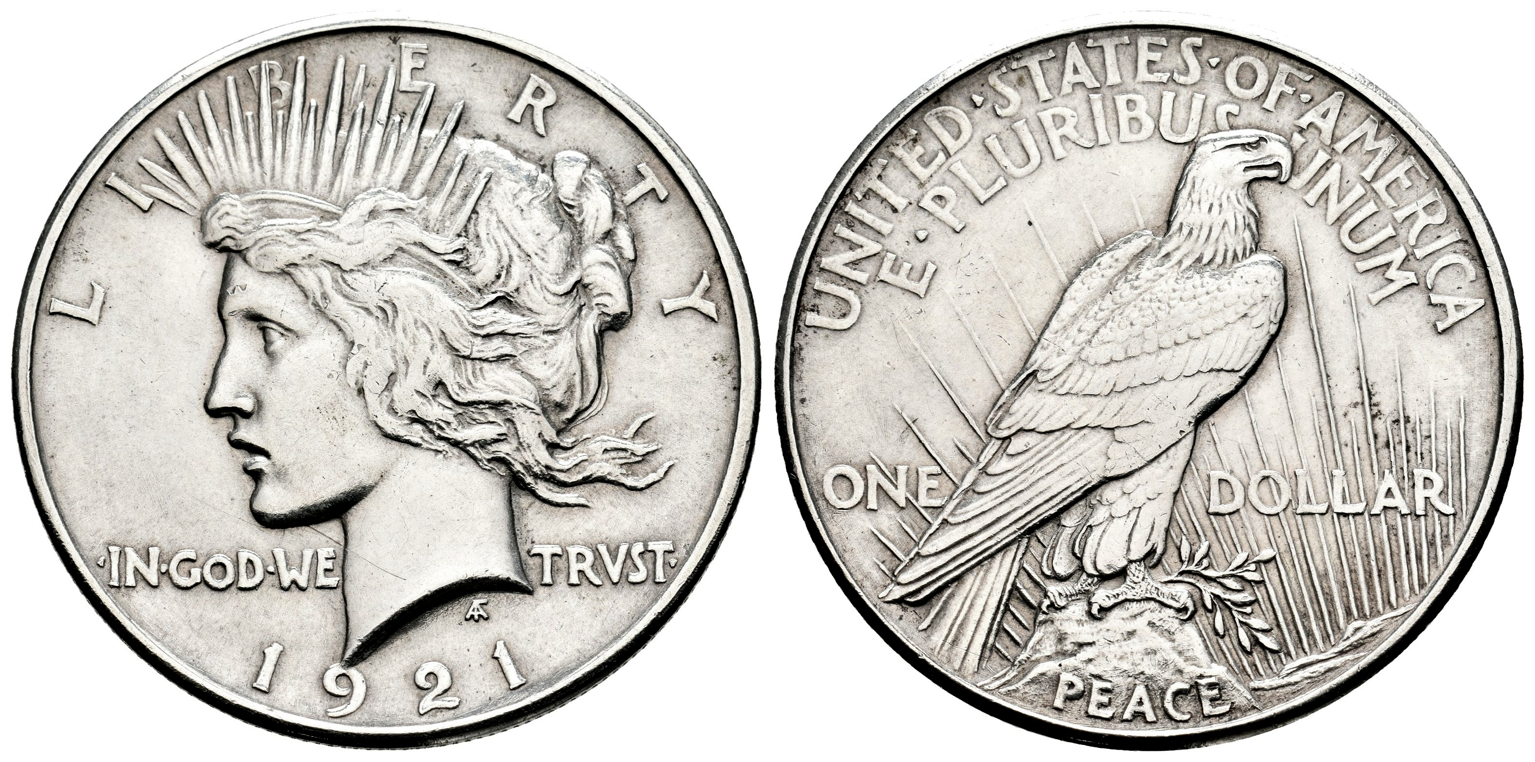 U.S. Coins. Peace Dollar. 1 dollar. 1921. Philadelphia. (Km-150). Ag. 26,77 g. Hairlines on obverse. Cleaned. Almost XF. Est...120,00.