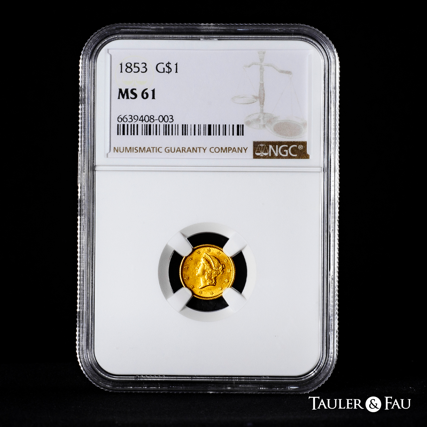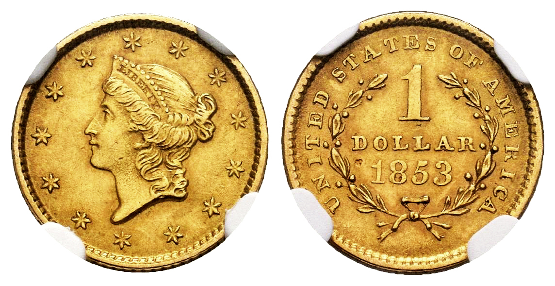 U.S. Coins. Liberty Head. 1 dollar. 1853. Philadelphia. (Km-73). (Fried-84). Au. Slabbed by NGC as MS 61. Est...400,00.
