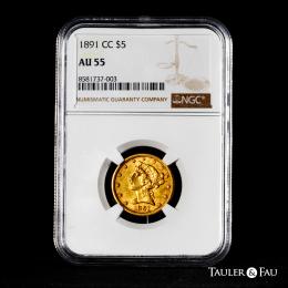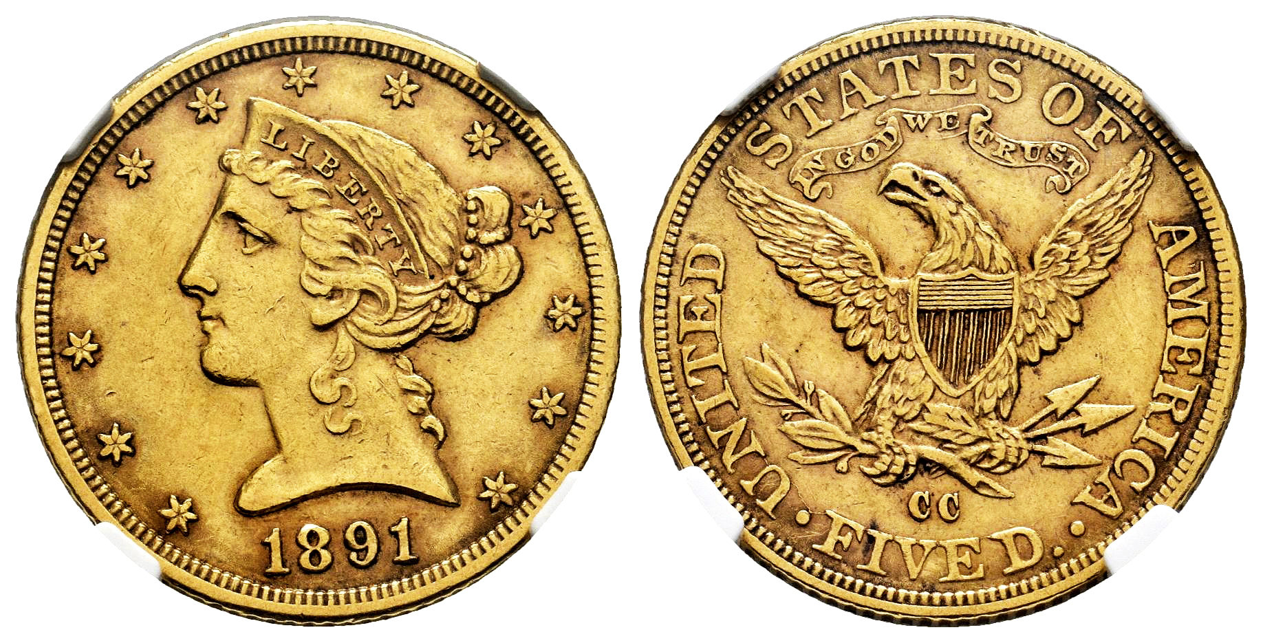 U.S. Coins. Liberty Half Eagles. 5 dollars. 1891. Carson City. CC. (Km-101). (Fr-146). Au. Very scarce. Slabbed by NGC as AU 55. Est...1500,00.
