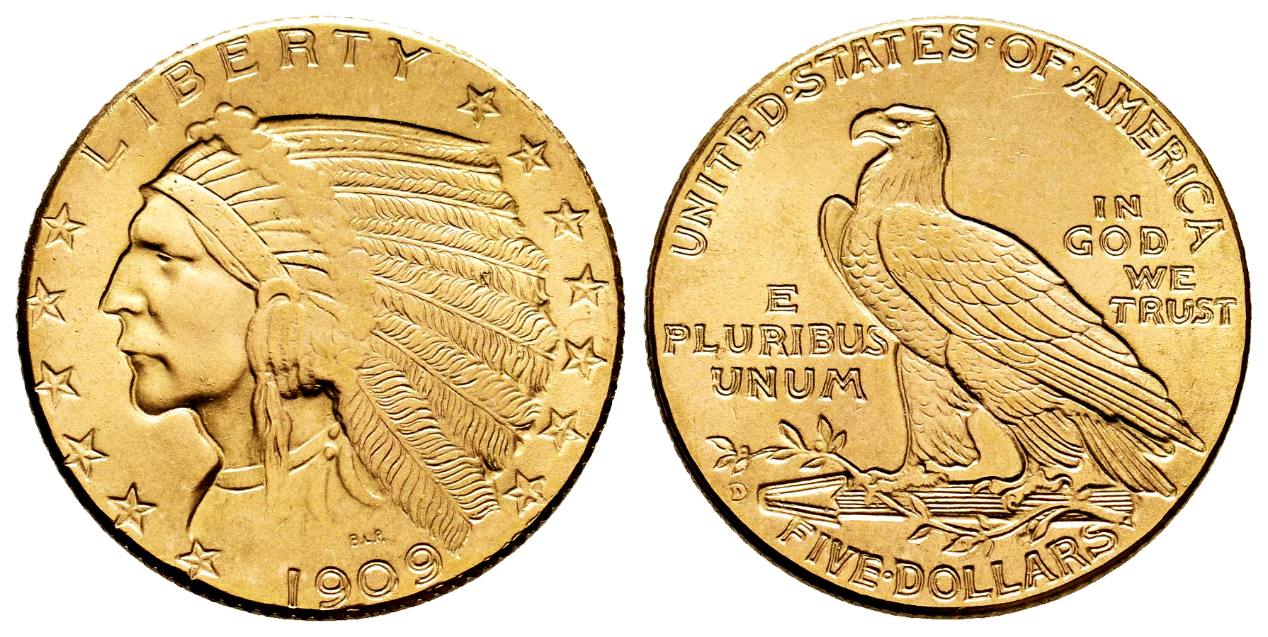 U.S. Coins. Indian Half Eagles. 5 dollars. 1909. Denver. D. (Km-129). (Fr-148). Au. 8,47 g. Original luster. AU. Est...650,00.