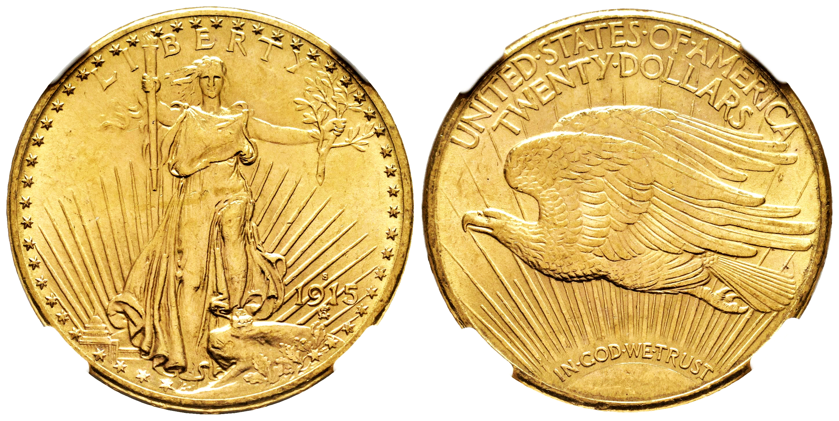 U.S. Coins. Double Eagle. Federal republic. 20 dollars. 1915. San Francisco. A. (Km-131). (Fried-186). Au. Original luster. Slabbed by NGC as MS 63. Est...3000,00.