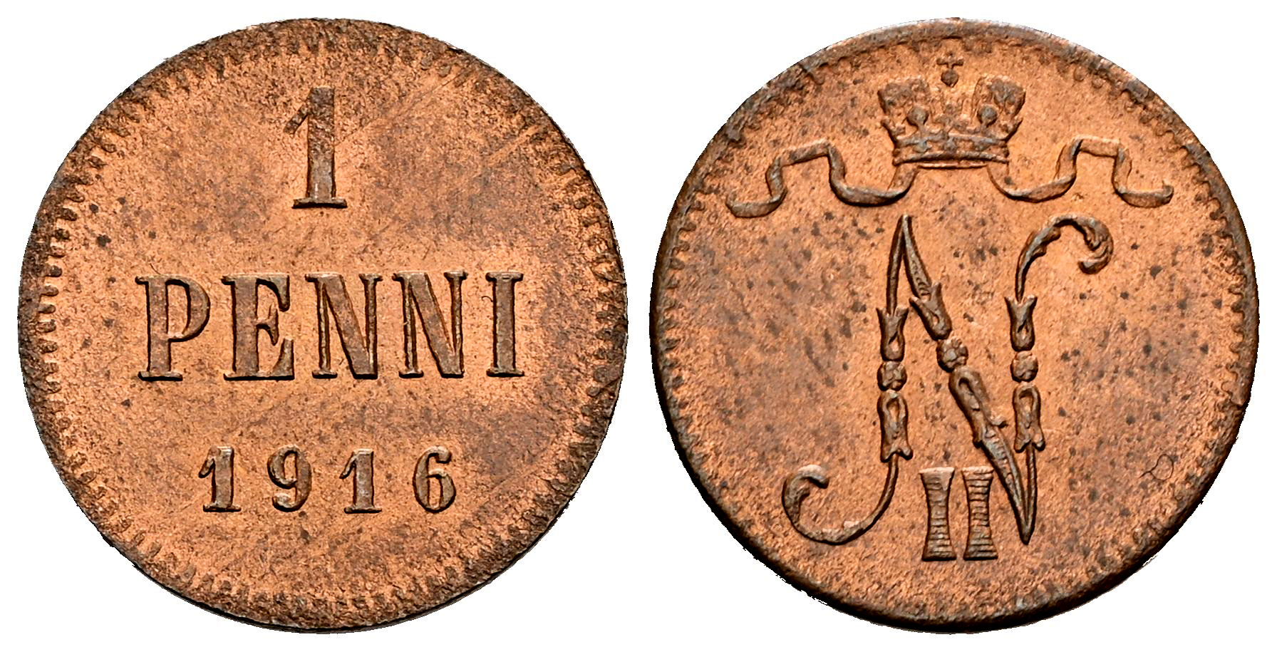 Finland. Nicholas II (1894-1917). 1 penni. 1916. (Km-13). (Bitkin-476). Ae. 1,18 g. Original luster. Almost MS. Est...15,00.