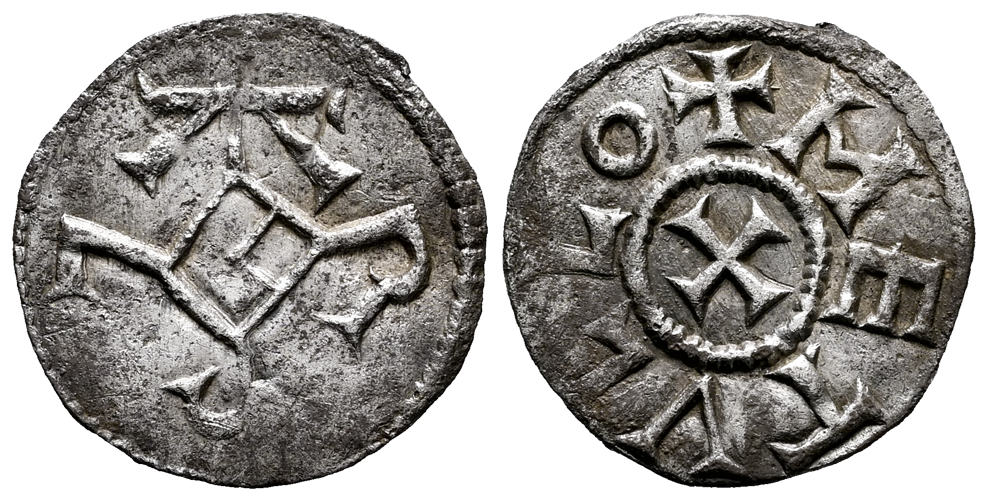 France. Carolingian Coinage. Charles II, le Chauve (840-877). Obol. Melle. (Depeyrot-622). (M&G-1060). (M.E.C.-1, 934). Anv.: Karolus monogram. Rev.: + METVLLO. Cross. Ag. 0,72 g. Choice VF/Almost XF. Est...300,00.