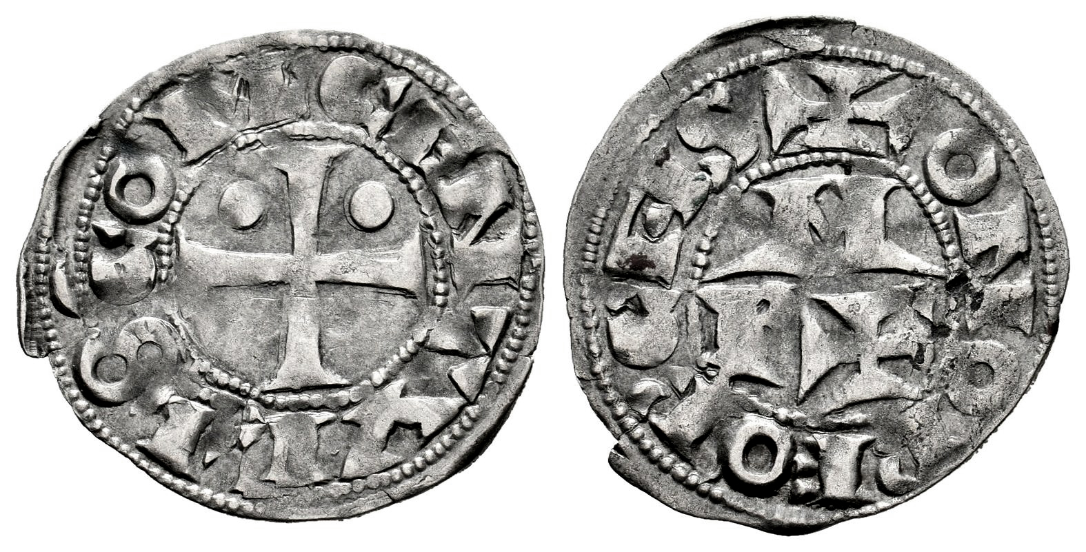 France. Viscounty of Béarn. In the name of Centule. Denier. (1080-1250). (Boudeau-525). (Duplessy-1241). (Cru C.G.-2030). Anv.: CENTVLLO COM' . Cross with pellets in the upper quarters. Rev.: + ONOR FORCAS, PAX in the center. Bi. 0,92 g. VF. Est...65,00.