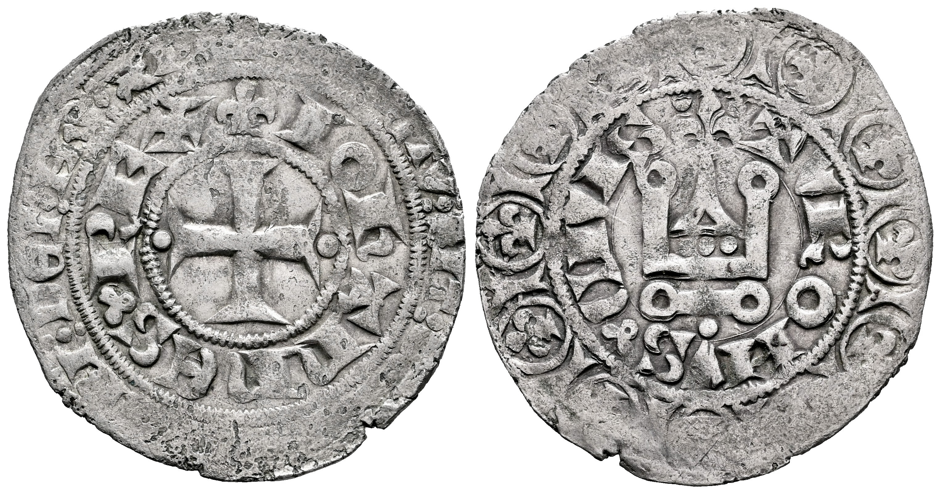 France. Jean II le Bon. Gross. (1350-1364). Tournai. 2nd emission. (Duplessy-297A). Anv.: IOHANNES REX. Rev.: TVRONVS CIVIS. Tournai Castle. Bi. 2,50 g. VF. Est...70,00.