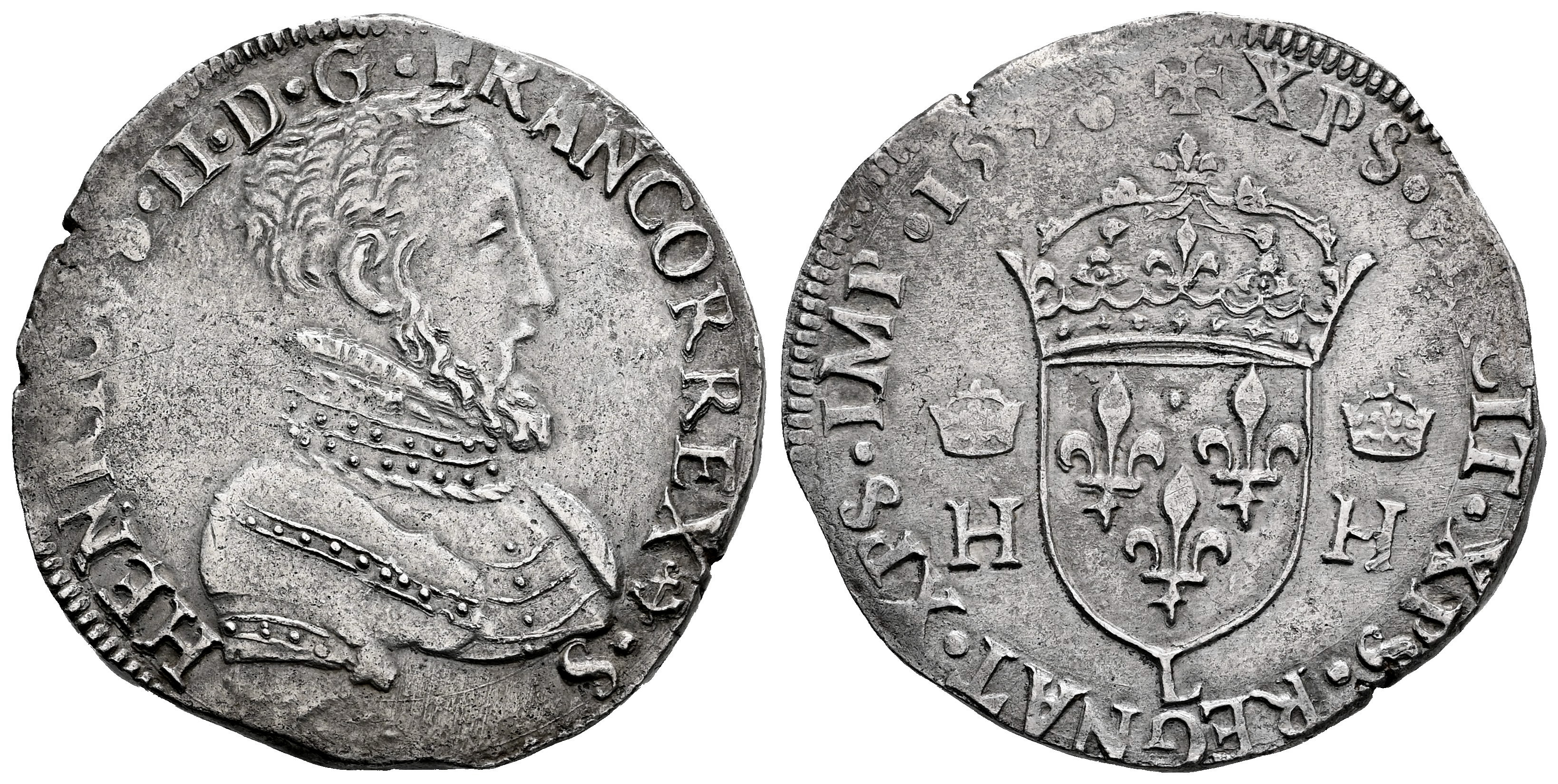 France. Henry II. Teston. 1556. Bayonne. L. (Duplessy-983). Ag. 9,48 g. Attractive patina. Scarce. Almost XF. Est...200,00.