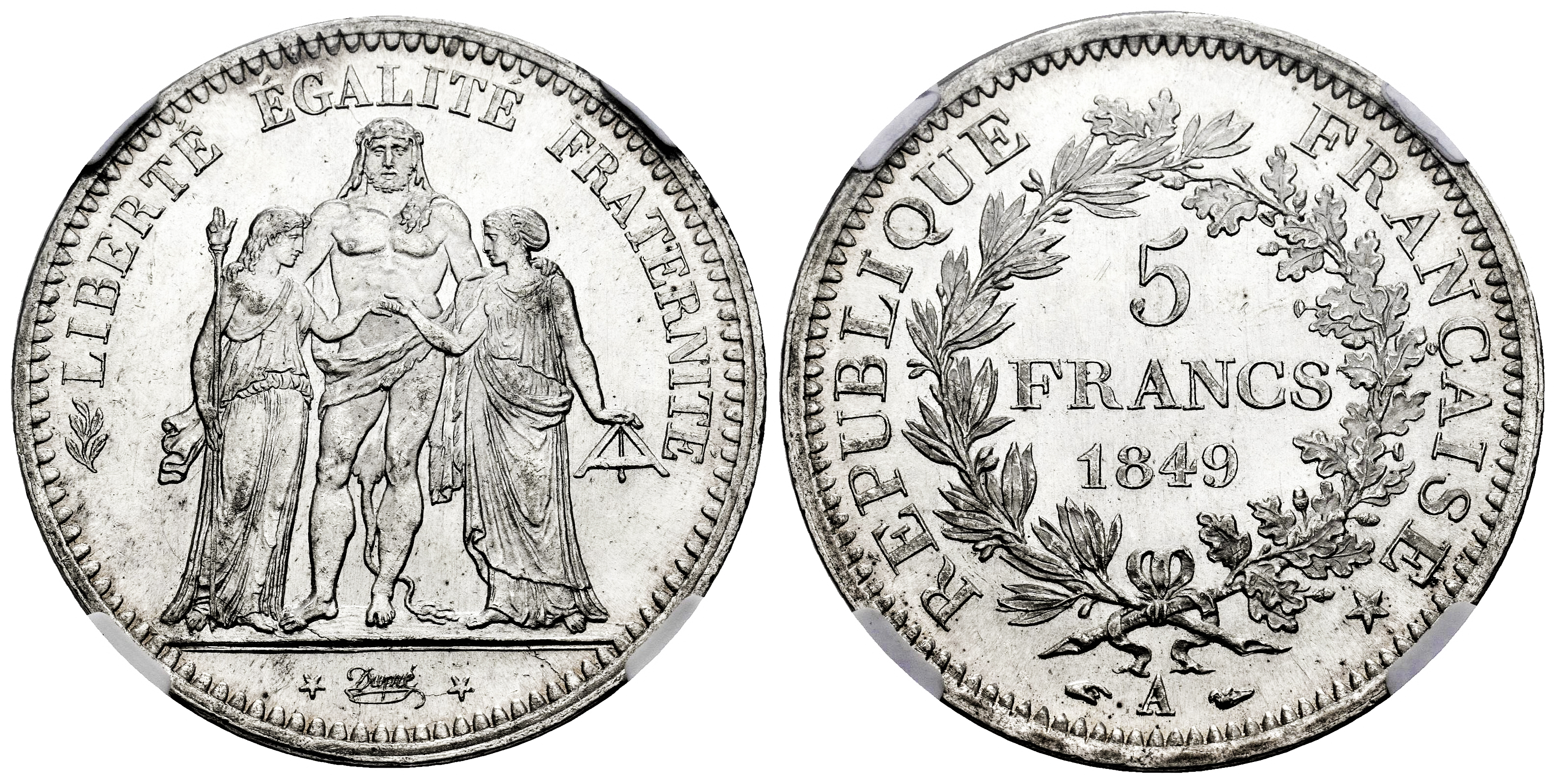 France. 5 francs. 1849. Paris. A. (Km-756.1). (Gad-683). Ag. Plenty of original luster. Slabbed by NGC as MS 62. Est...150,00.