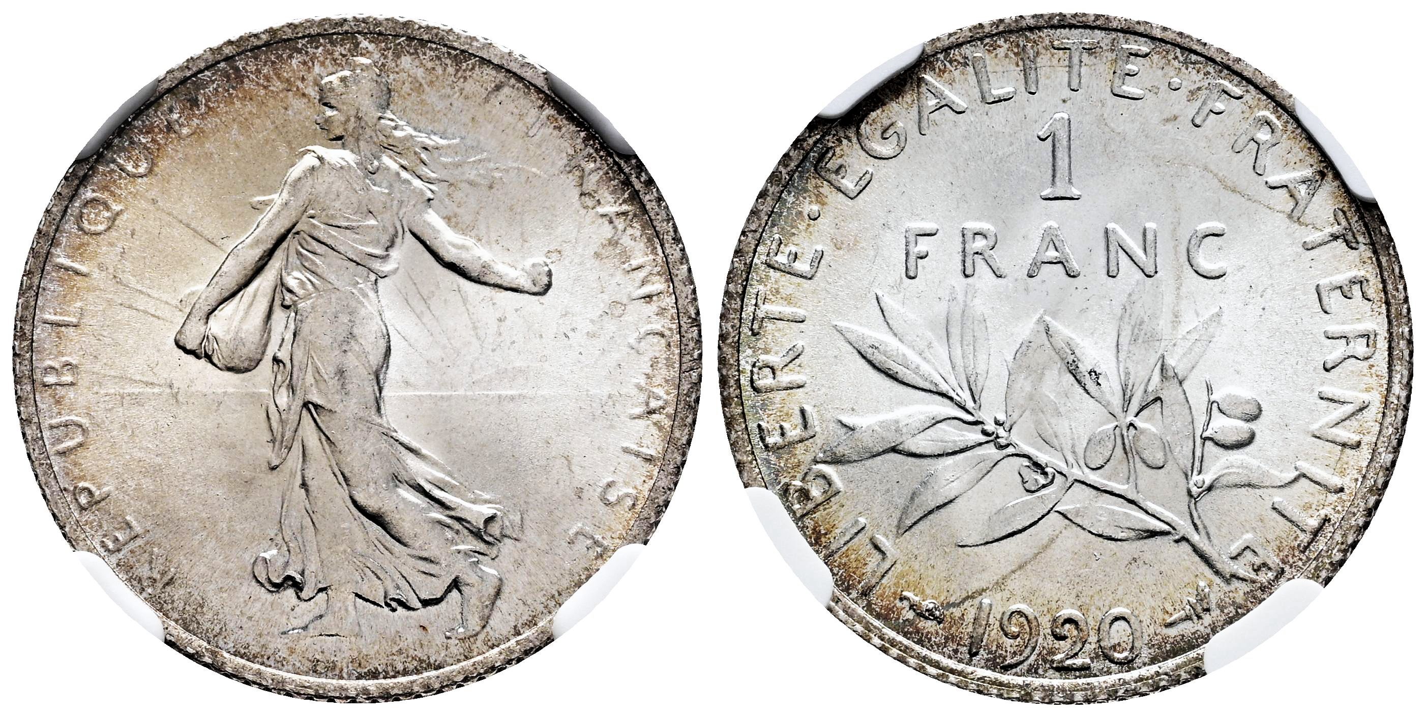 France. 1 franc. 1920. Paris. (Km-844.1). (Gad-467). Ag. Slabbed by NGC as MS 65. Est...60,00.