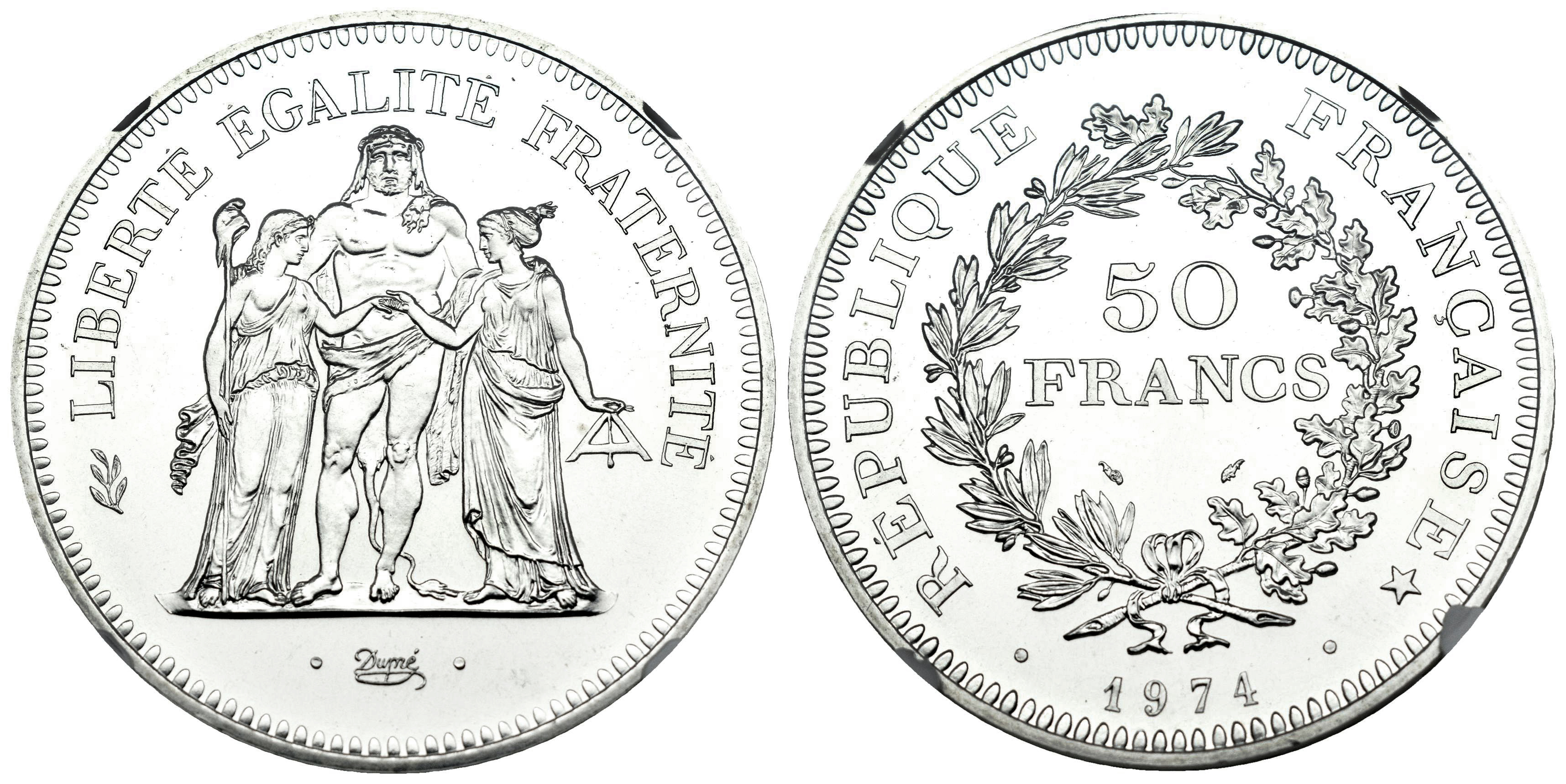 France. 50 francs. 1974. (Km-941.1). (Gad-882). Ag. Slabbed by NGC as MS 67. Est...90,00.