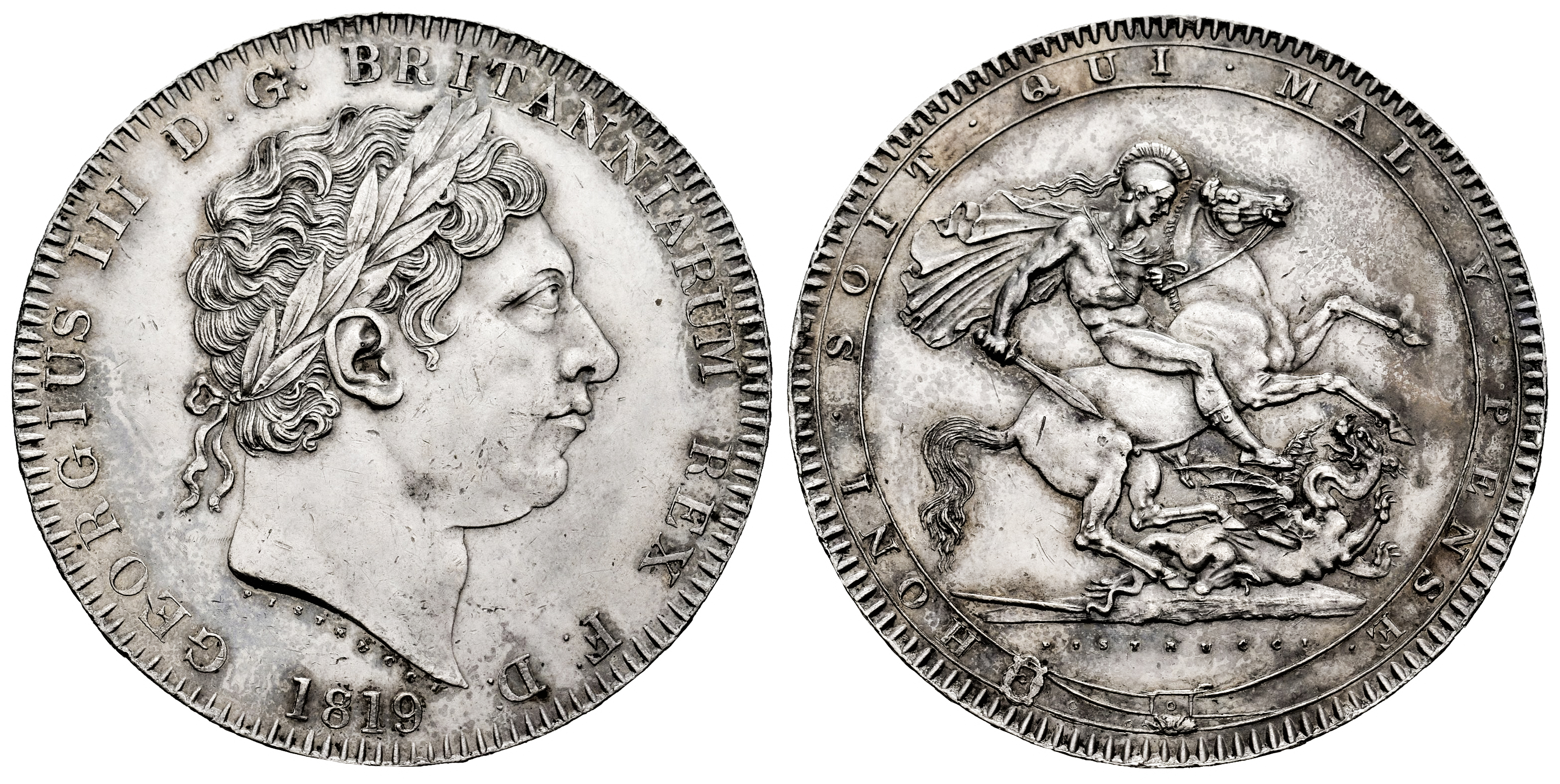 Great Britain. George III. 1 crown. 1819. (Km-675). (S-3787). (Dav-103). Ag. 28,35 g. Relief legend on edge: DECUS ET TUTAMEN ANNO REGNI LIX. Traces of luster. XF/AU. Est...650,00.