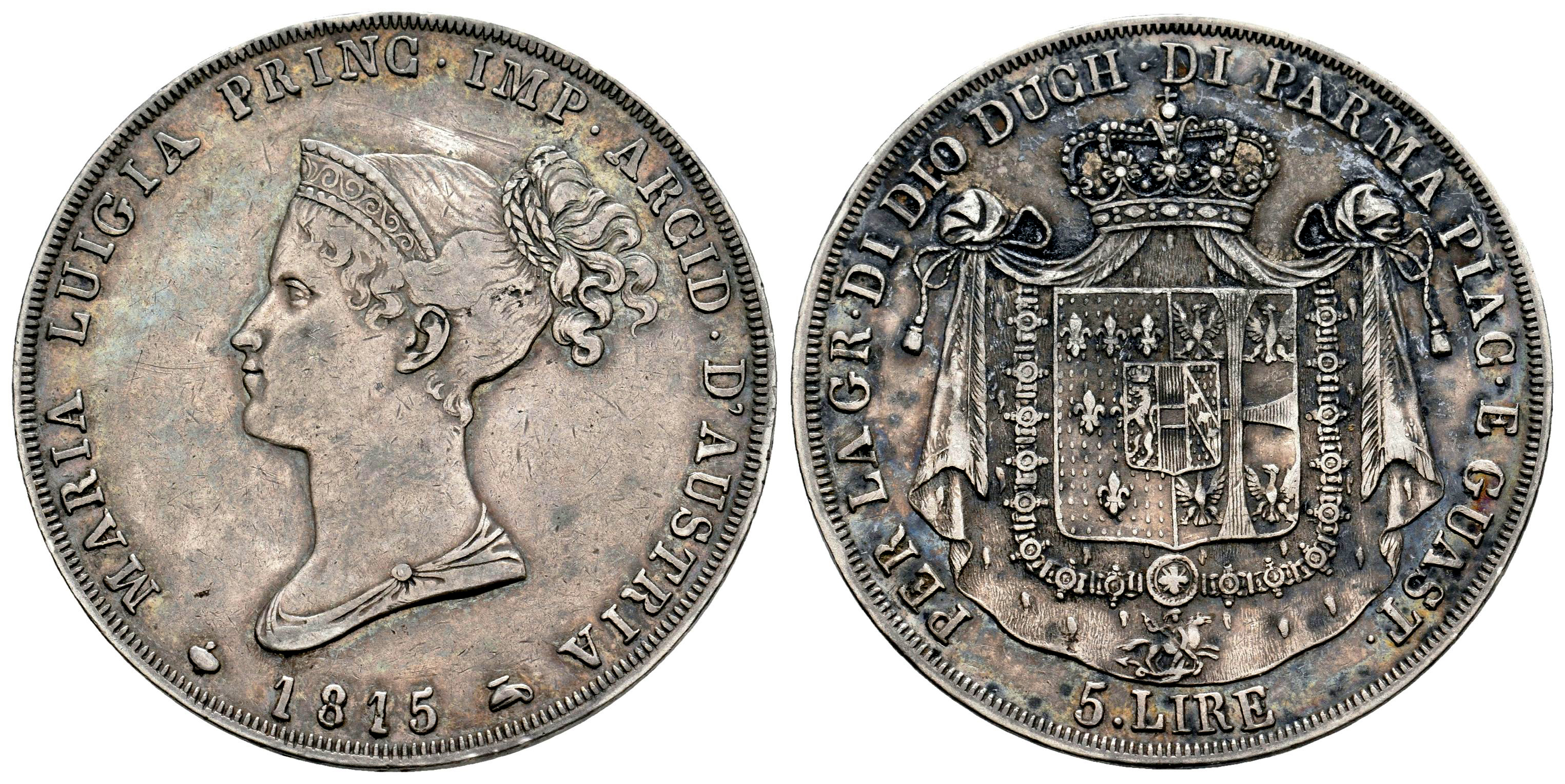Italy. Parma. Maria Luigia. 5 lire. 1815. Milano. (Km-30). (Mont-115). Ag. 24,88 g. Rust on reverse. Choice VF. Est...100,00.