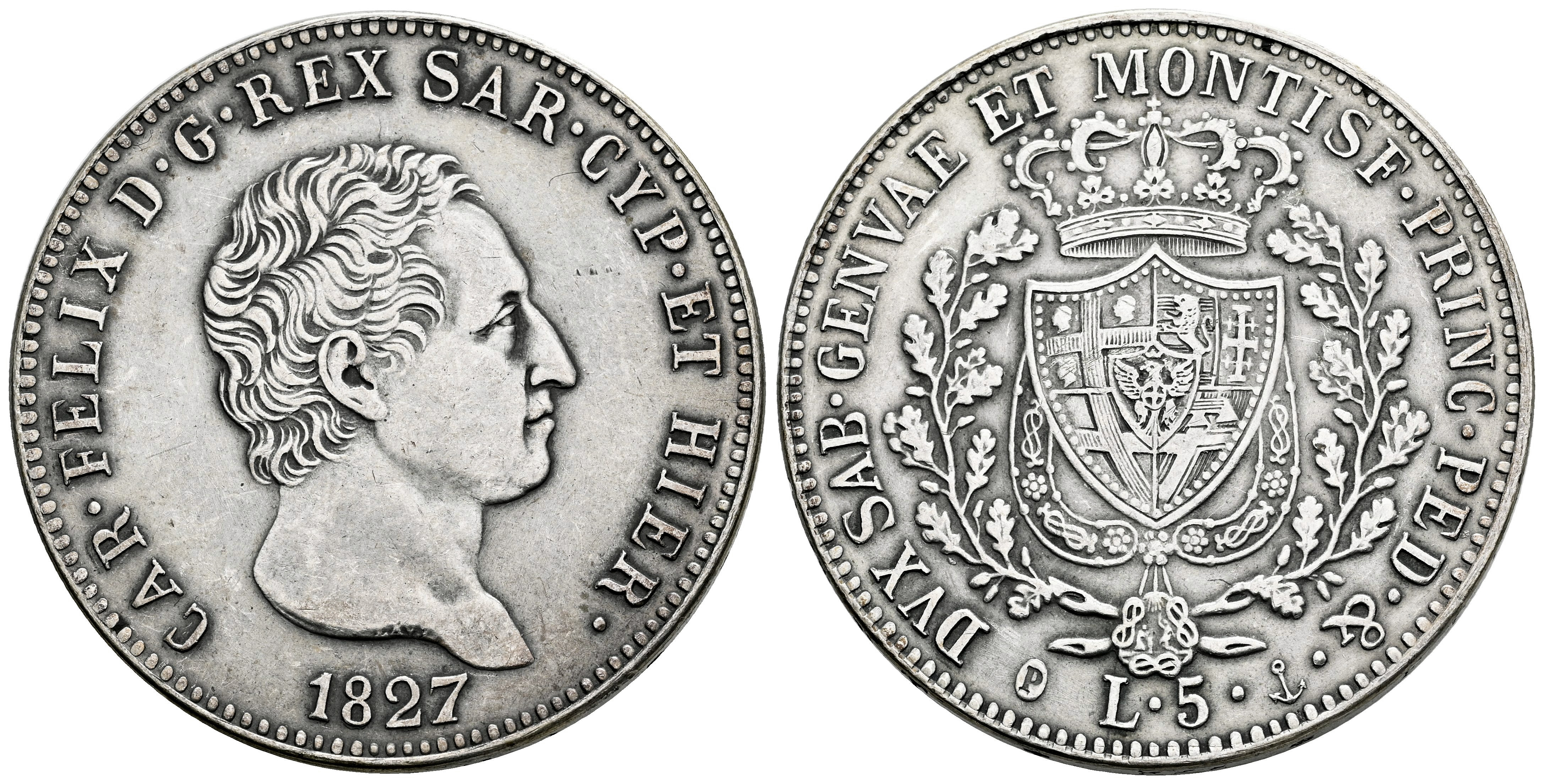 Italy. Sardinia. Carlo Felice. 5 lire. 1827. Genoa. (Km-116.2). (Pagani-72). (Mont-64). Ag. 24,64 g. Patina. Choice VF. Est...60,00.
