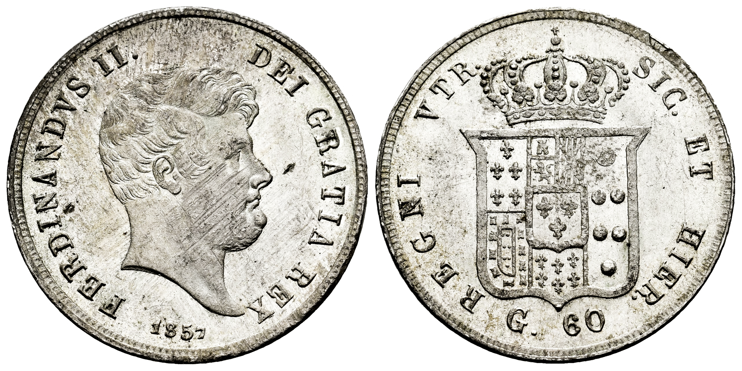 Italy. Ferdinando II. 1/2 piastra (60 grana). 1857. Naples. (Pagani-249). (Pannuti-Riccio-111). (Mir-507/10). Ag. 13,75 g. Striking lines on obverse. Original luster. Scarce in this state of preservation. AU. Est...350,00.