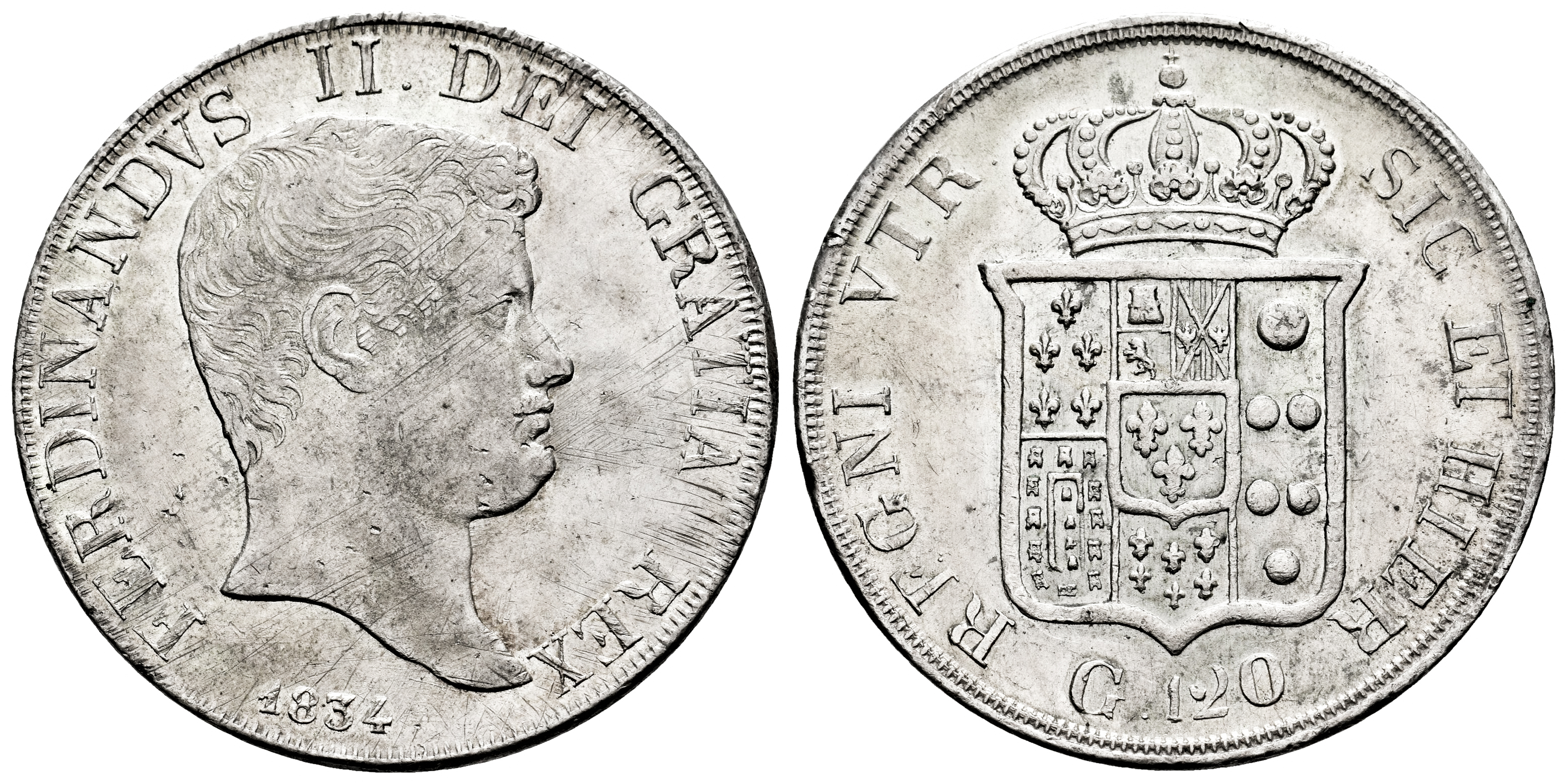 Italy. Ferdinando II. Piastra (120 grana). 1834. Naples. (Km-309). Ag. 27,52 g. Light adjustment marks. Traces of luster. XF. Est...250,00.
