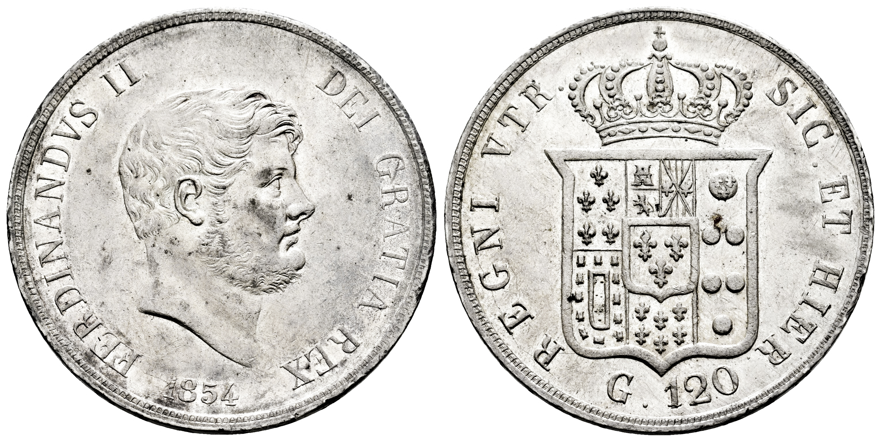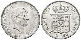 Italy. Ferdinando II. 120 grana. 1854. Naples. (Pagani-219). (Pannuti-Riccio-83). (Mir-503/3). Ag. 27,50 g. Delicate patina. Original luster. XF. Est...200,00.