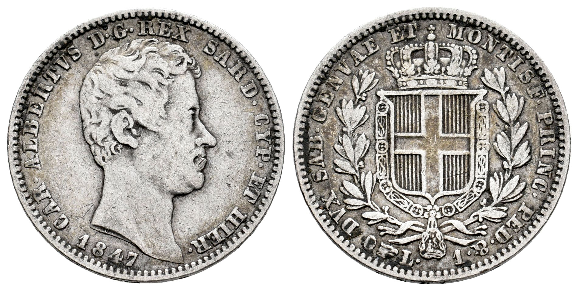Italy. Sardinia. Carlo Alberto. 1 lira. 1847. Torino. (Km-129.1). (Pagani-312). Ag. 4,88 g. Mintmark: Eagle. Rare. VF. Est...90,00.