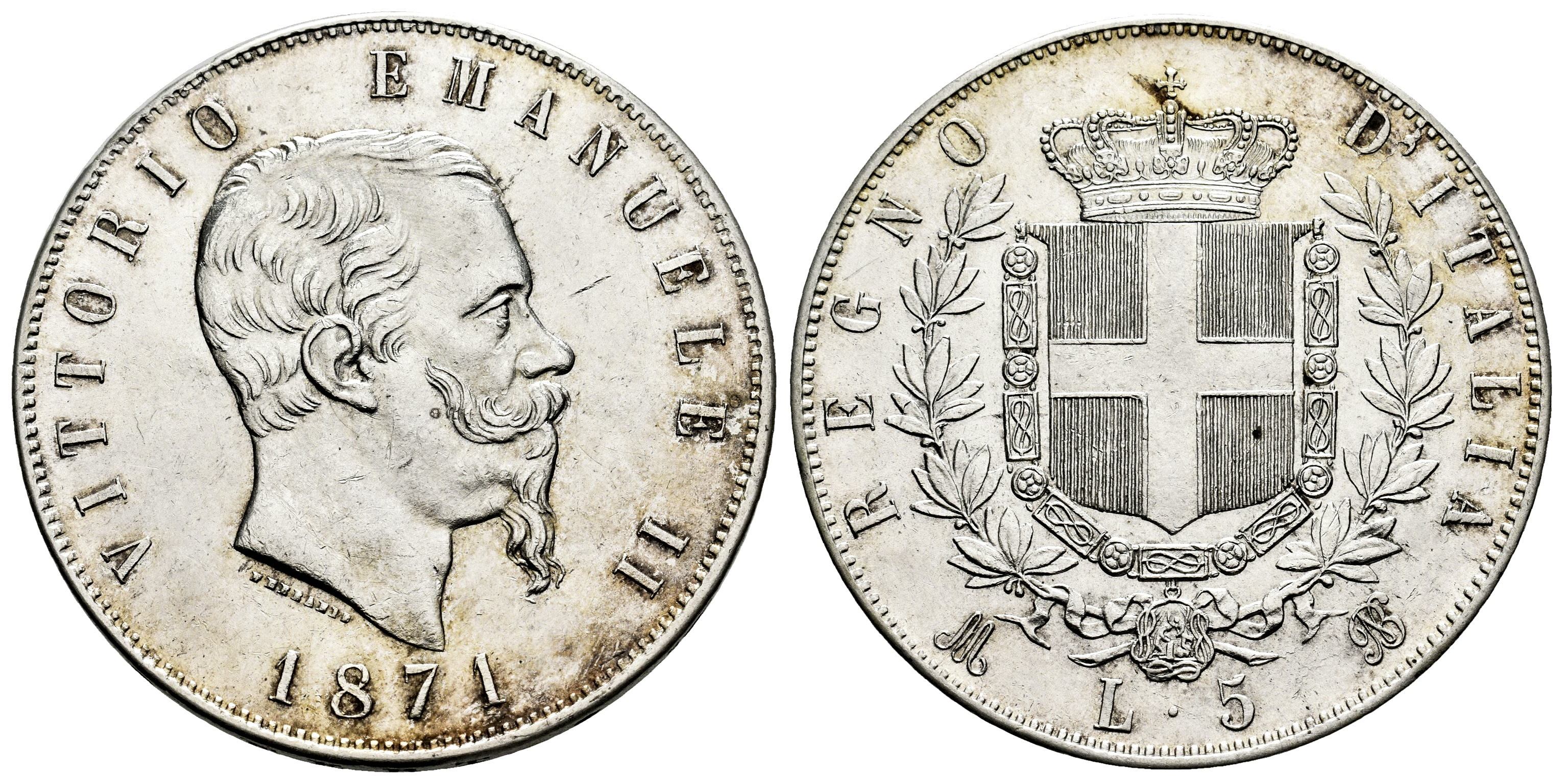 Italy. Vittorio Emanuele II. 5 lire. 1871. Milano. (Pagani-492). (Gig-42). (Mont-175). Ag. 24,09 g. Faint scratches. Traces of luster. XF. Est...200,00.