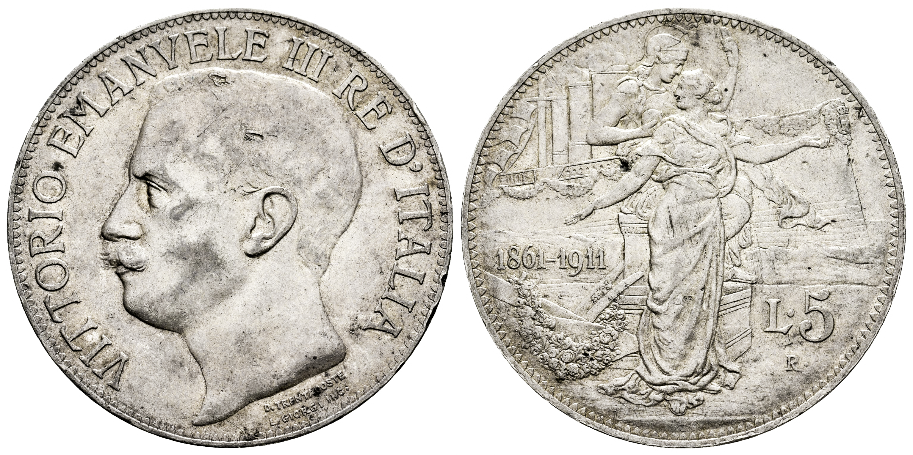 Italy. Vittorio Emanuele III. 5 lire. 1911. Rome. (Pagani-707). (Gig-71). (Mont-111). Ag. 25,00 g. Dos golpes en el busto y golpecitos en el canto. Rara. Choice VF. Est...900,00.