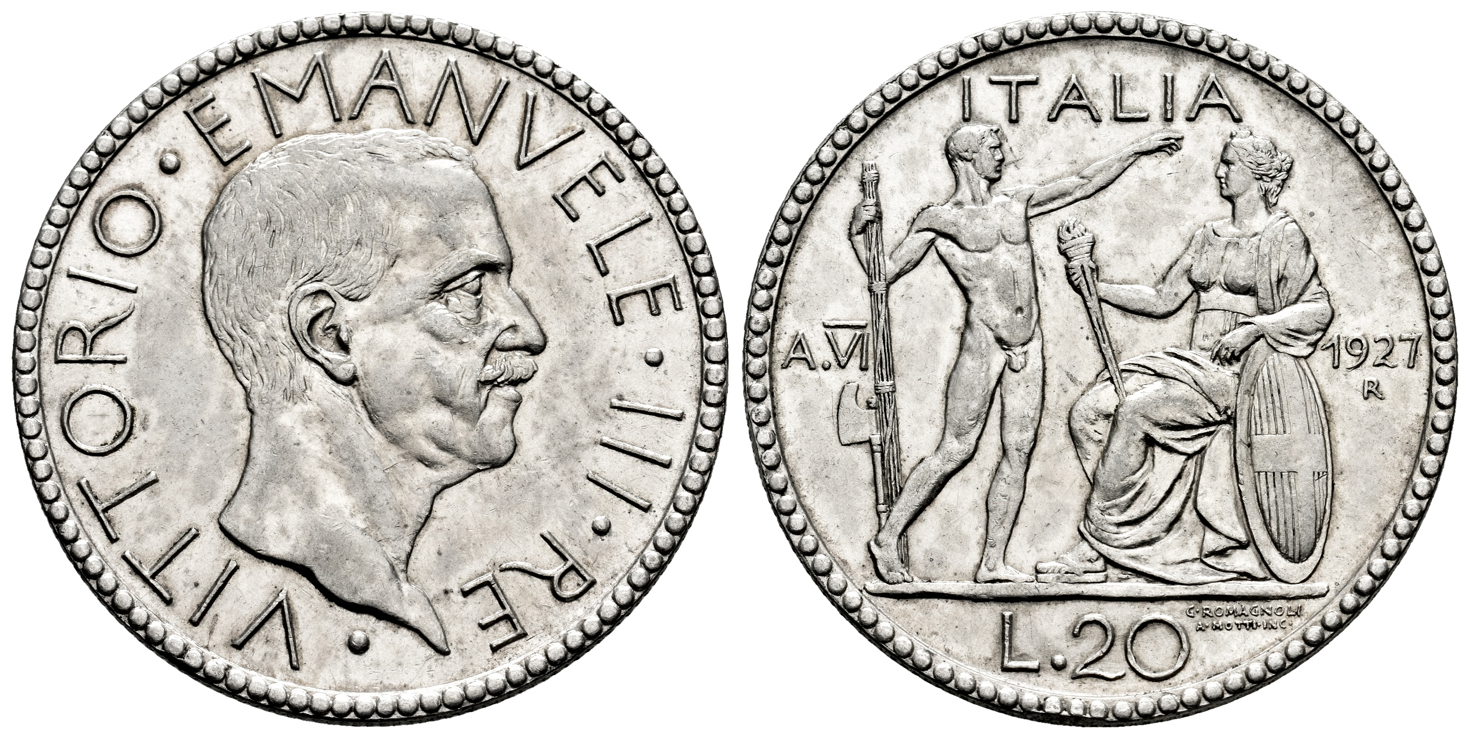 Italy. Vittorio Emanuele III. 20 lire. 1927 Anno VI. Rome. (Pagani-672). (Gig-36). (Mont-65). Ag. 14,91 g. Minor nick on edge. Original luster. XF. Est...300,00.