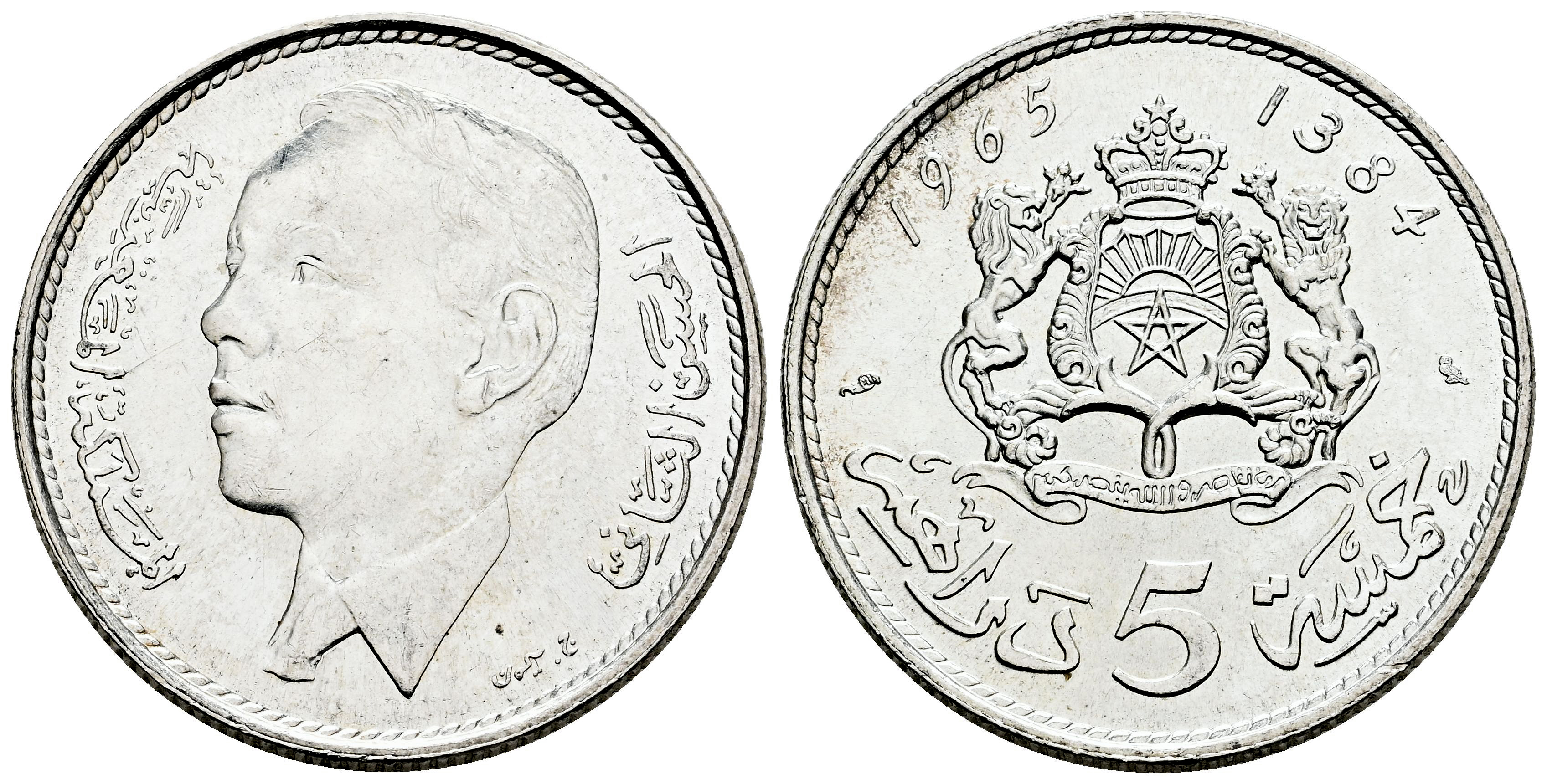 Morocco. Hassan II. 5 dirhams. 1384 H (1965). Paris. (Km-Y#57). Ag. 11,77 g. Plenty of original luster. Mint state. Est...25,00.