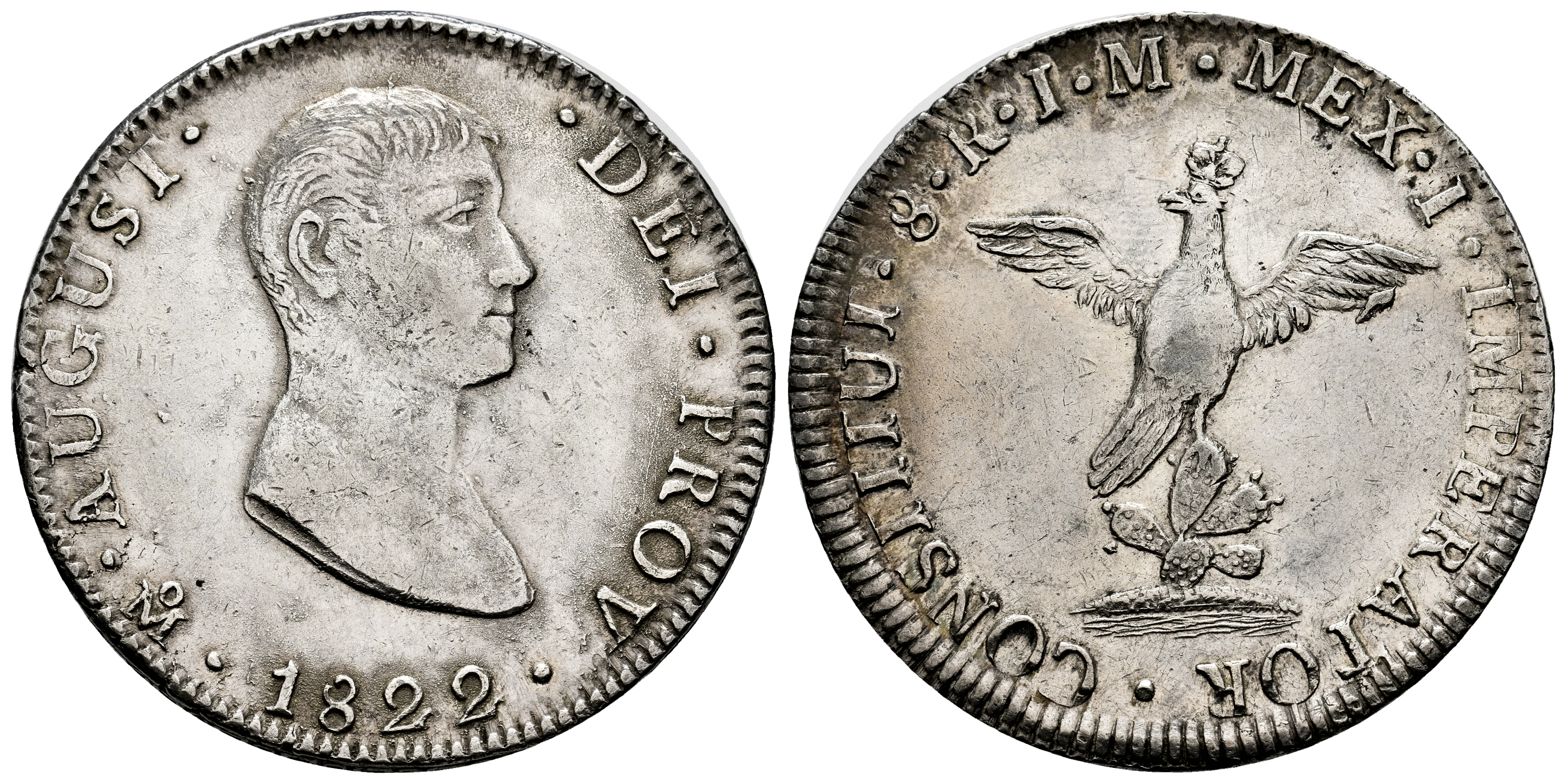 Mexico. Agustín de Iturbide. 8 reales. 1822. Mexico. JM. (Km-304). Ag. 27,08 g. First and, popular type known as "Pollito". Minimal defects on the edge. Lightly cleaned. Rare. Choice VF/Almost XF. Est...900,00.