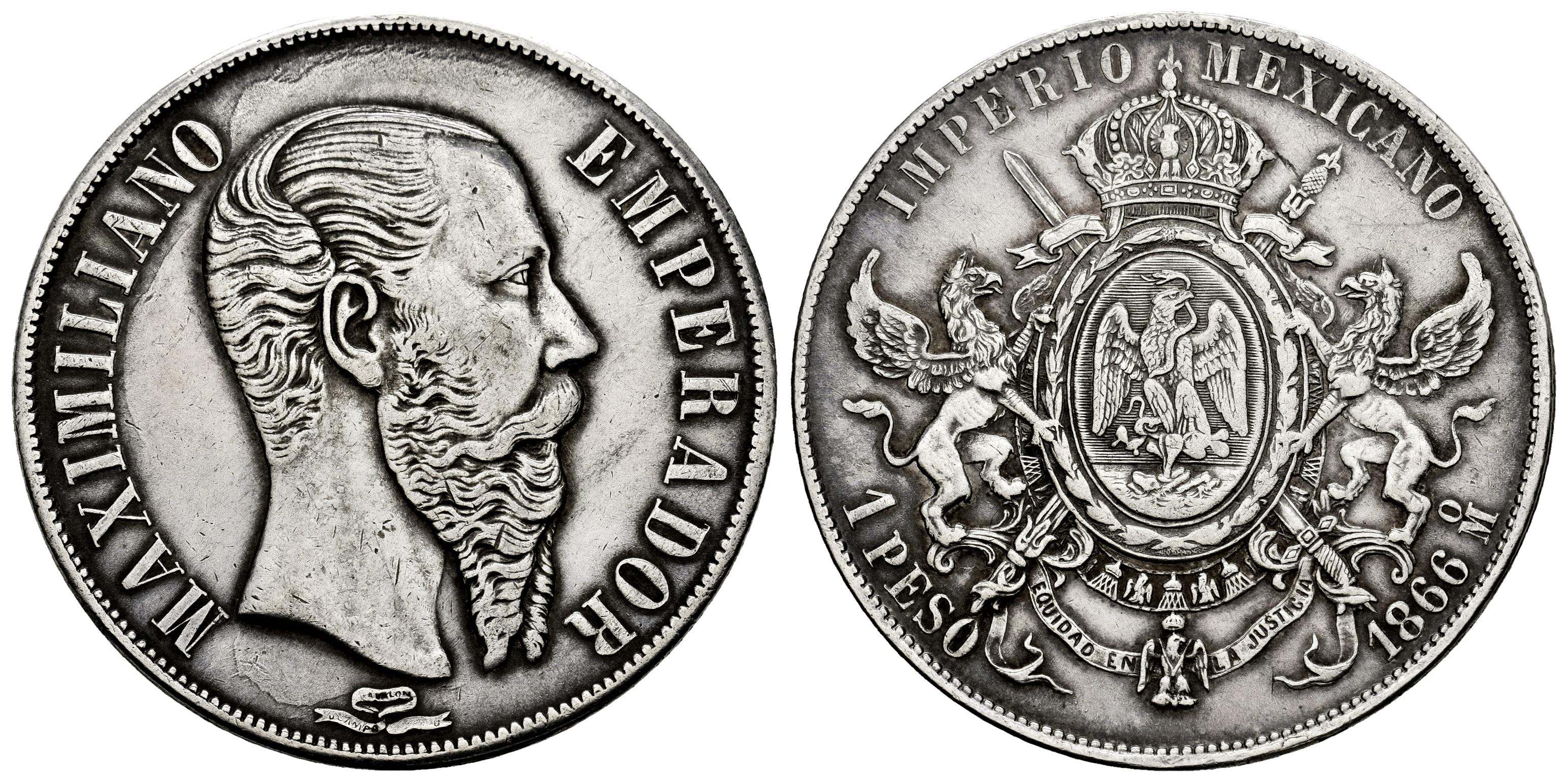 Mexico. Maximiliano. 1 peso. 1866. Mexico. (Cal-388.1). Ag. 27,08 g. Cleaned. Scarce. Choice VF. Est...250,00.