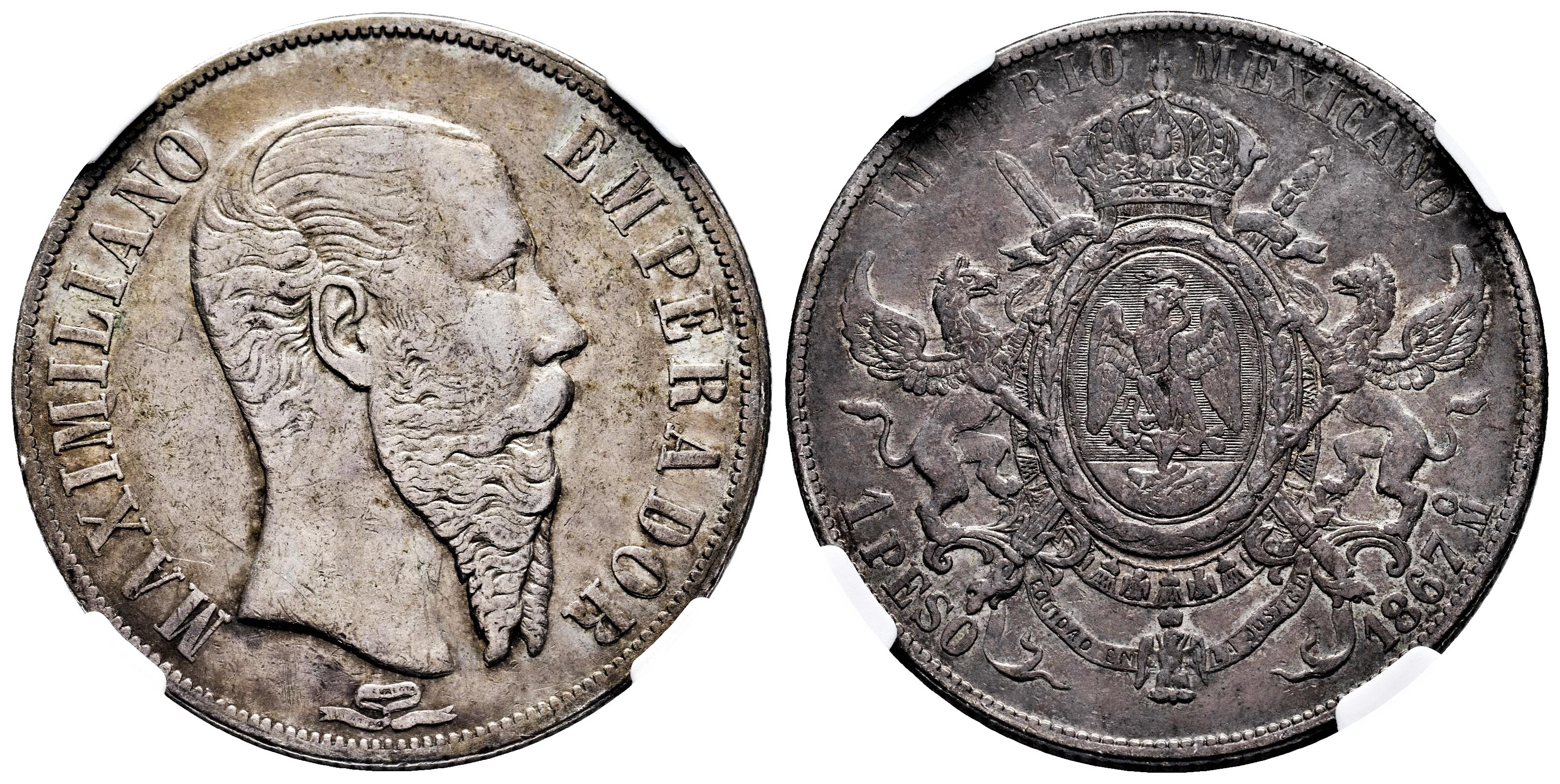 Mexico. Maximiliano. 1 peso. 1867. Mexico. (Km-388.1). Ag. Light tone. Scarce. Slabbed by NGC as XF 45. Est...400,00.