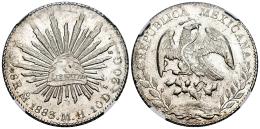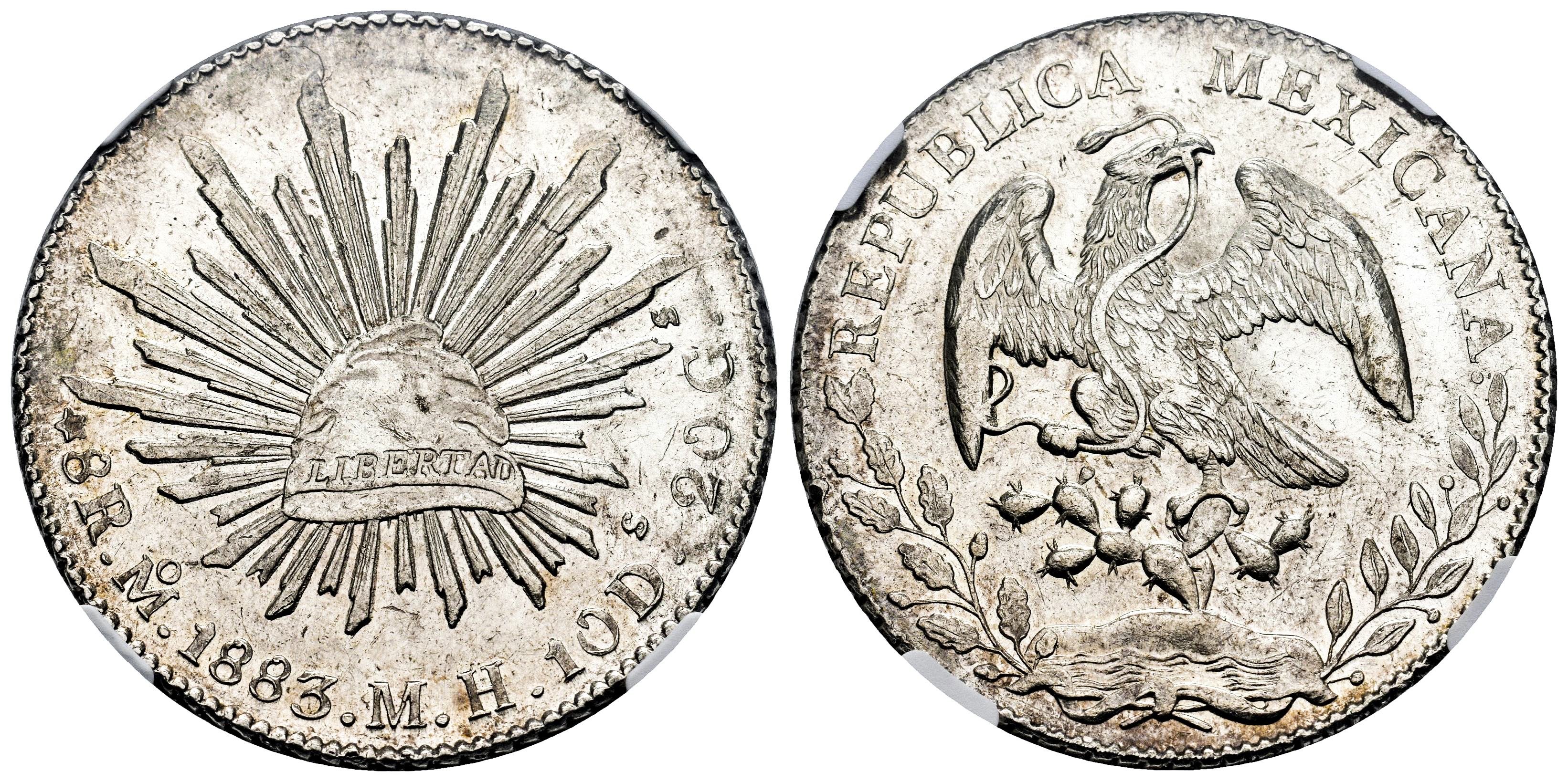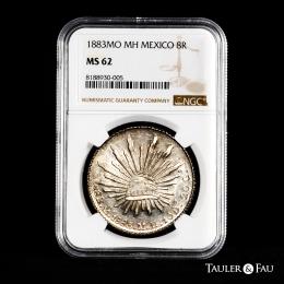 Mexico. 8 reales. 1883. Mexico. MH. (Km-377). Ag. Original luster. Attractive. Scarce in this grade. Slabbed by NGC as MS 62. Est...250,00.