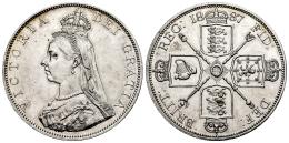Great Britain. Victoria. 2 florins. 1887. (Km-763). Ag. 22,63 g. Finas y suaves rayitas superficiales. Restos de brillo original. AU. Est...100,00.