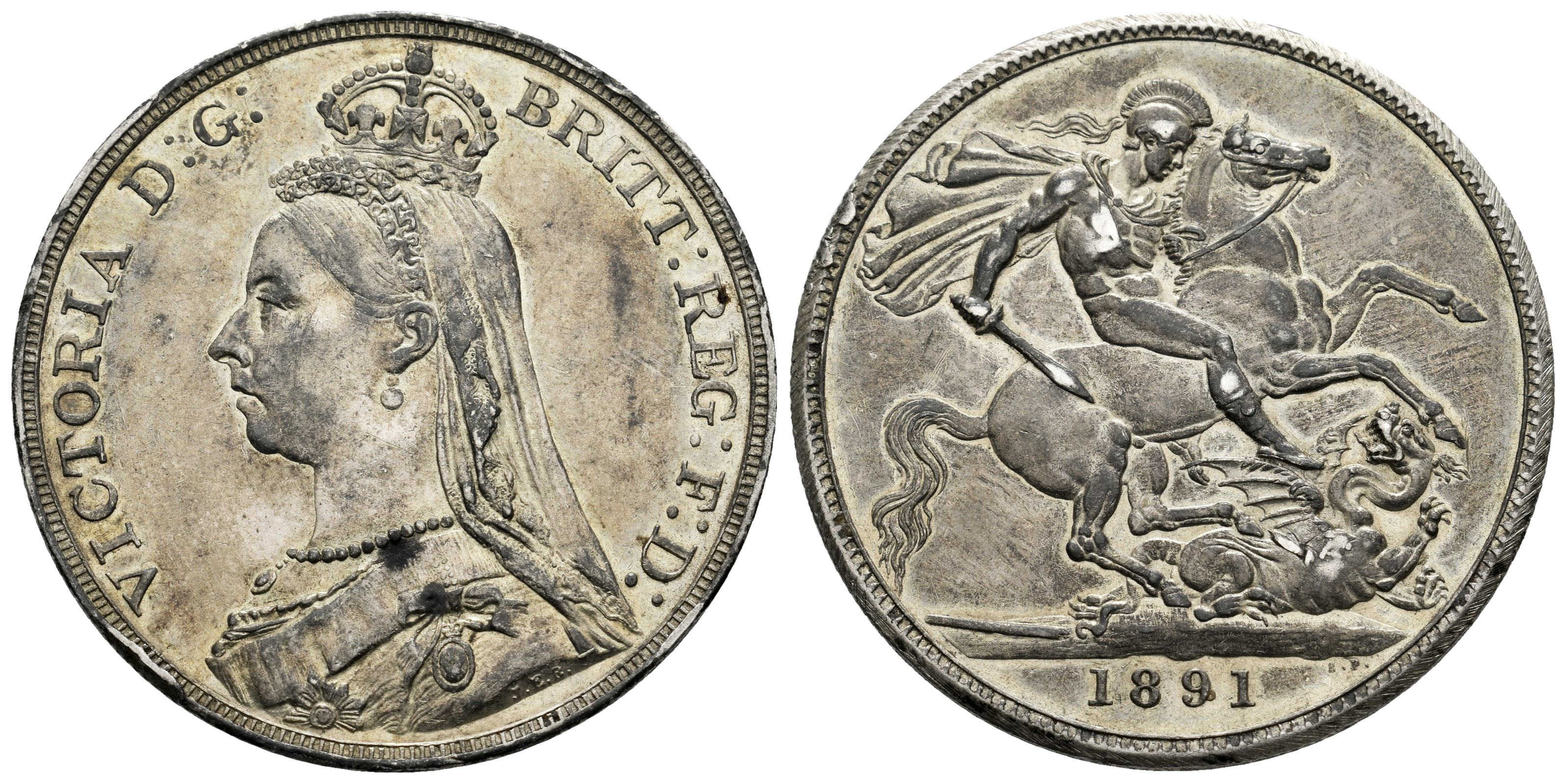 Great Britain. Victoria. 1 crown. 1891. (Km-765). (S-3921). Ag. 27,96 g. Knocks on edge. Patina. XF/Almost XF. Est...90,00.