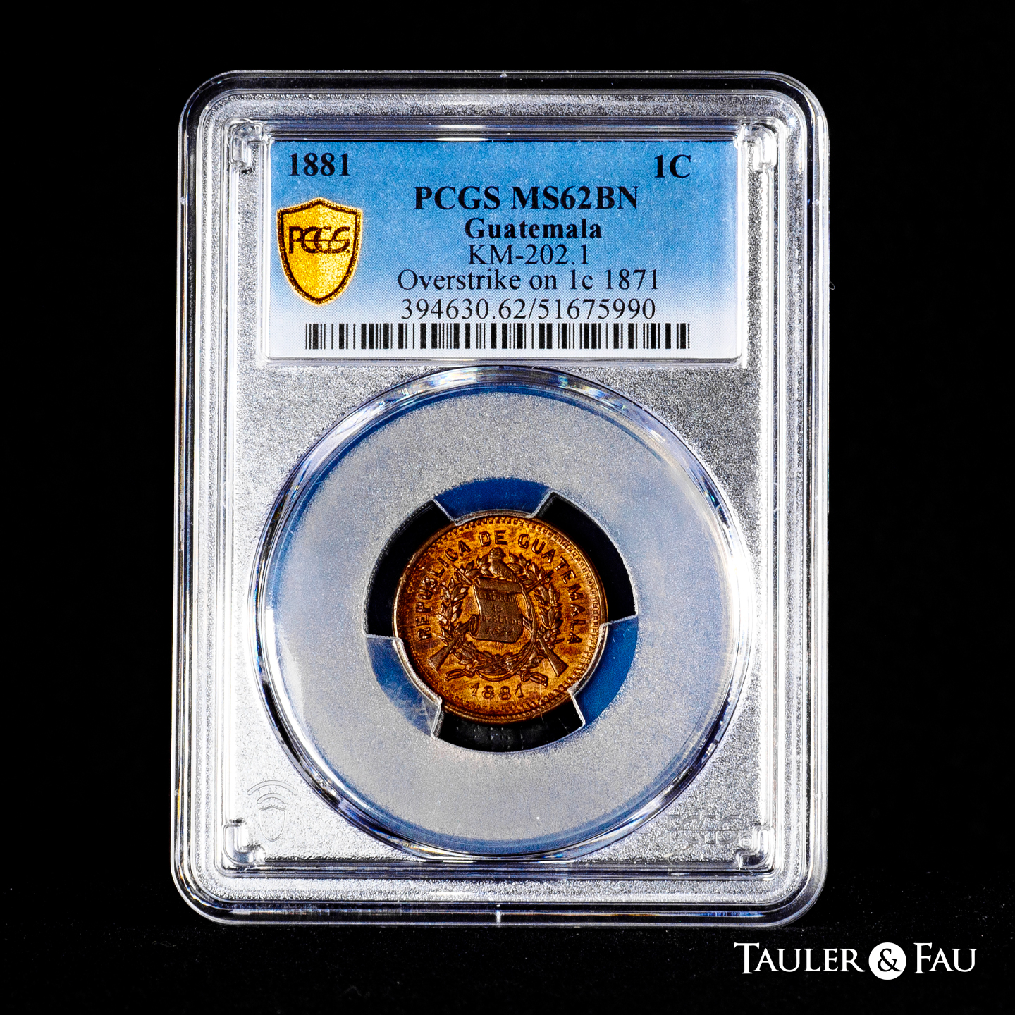 Guatemala. 1 centavo. 1881. (Km-202.1). Ae. Slabbed by PCGS as MS 62 BN. Minted on 1 centavo 1871. Est...100,00.