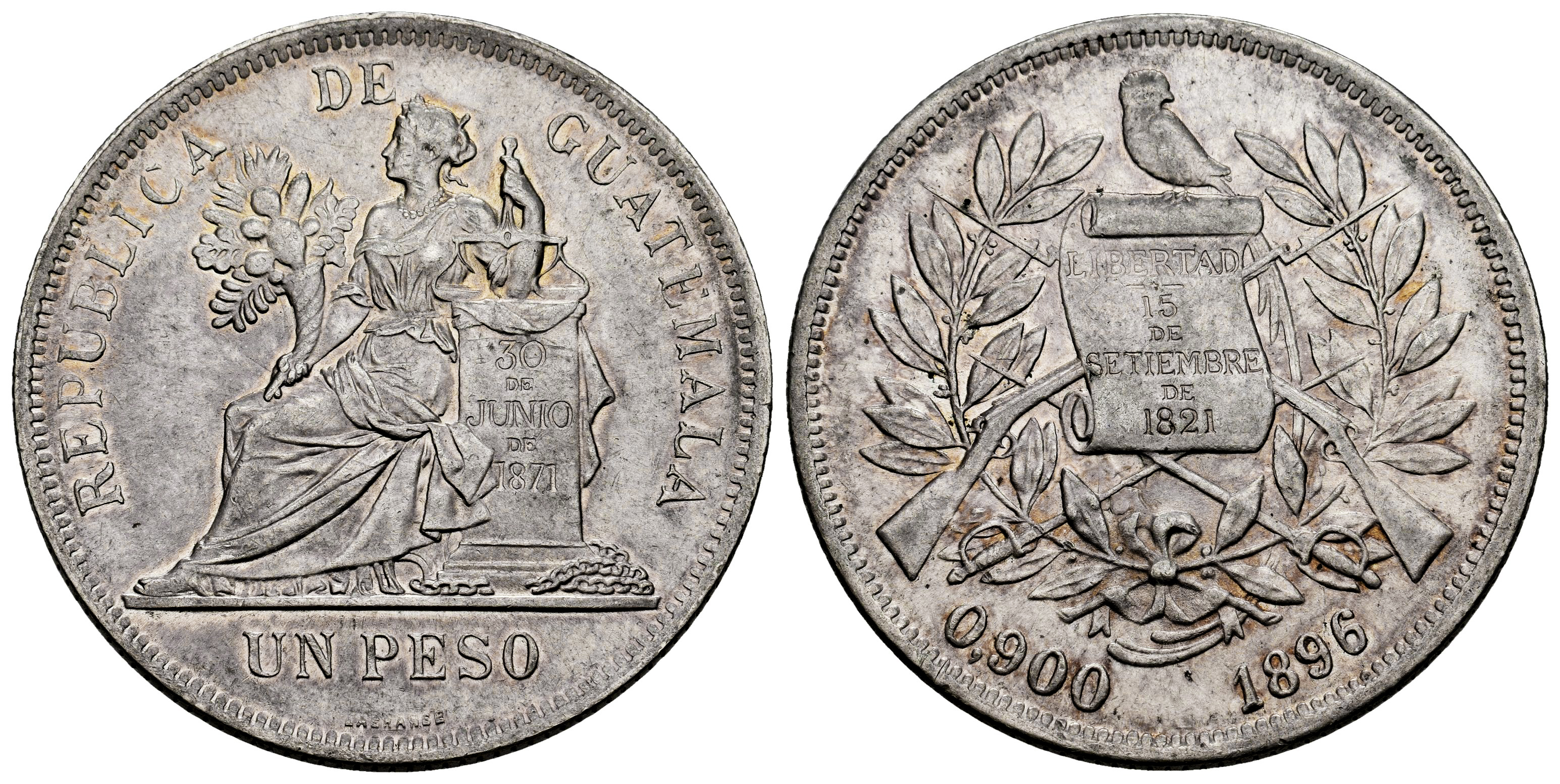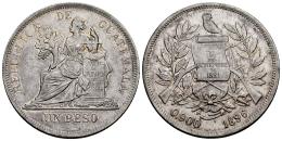 Guatemala. 1 peso. 1896. (Km-210). Ag. 24,58 g. Original luster. Delicate patina. XF. Est...100,00.