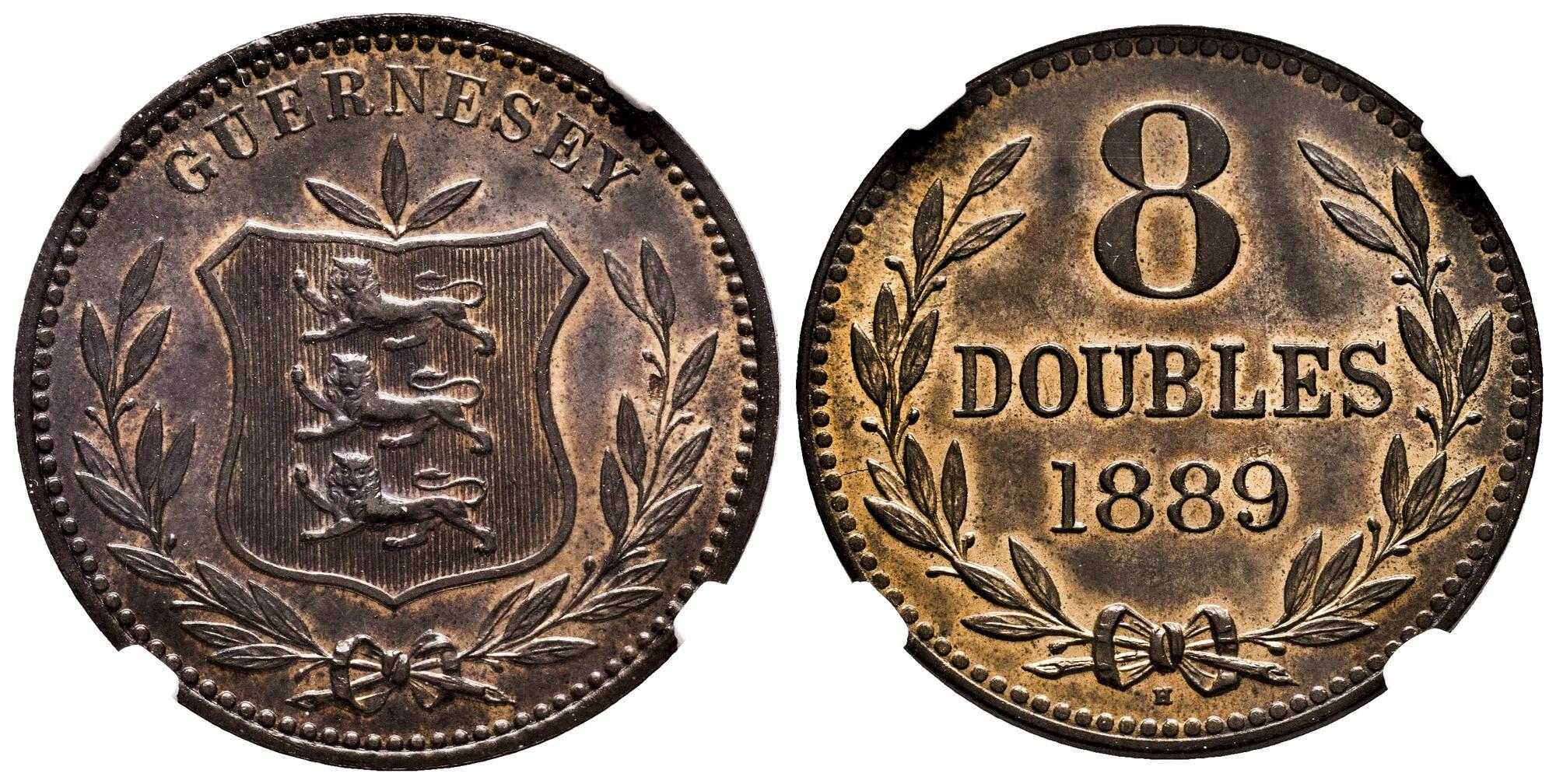 Guernsey. Victoria Queen (1837-1901). 8 doubles. 1889. Heaton. H. (Km-7). Ag. Very scarce in this grade. Slabbed by NGC as MS 64 BN. Est...120,00.