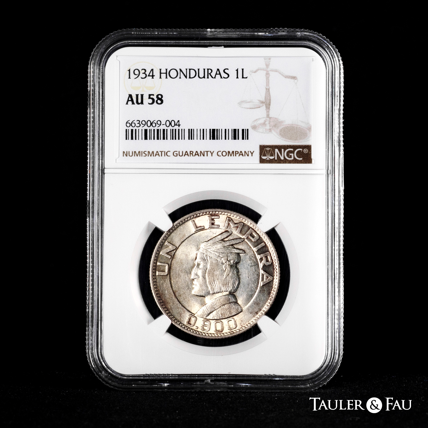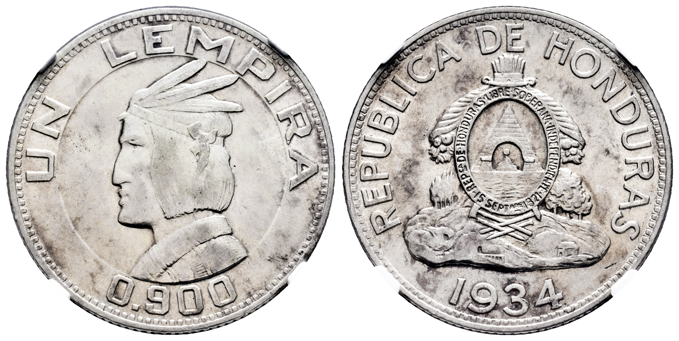 Honduras. 1 Lempira. 1934. Philadelphia. (Km-75). Au. Original luster. Slabbed by NGC as AU 58. Est...100,00.