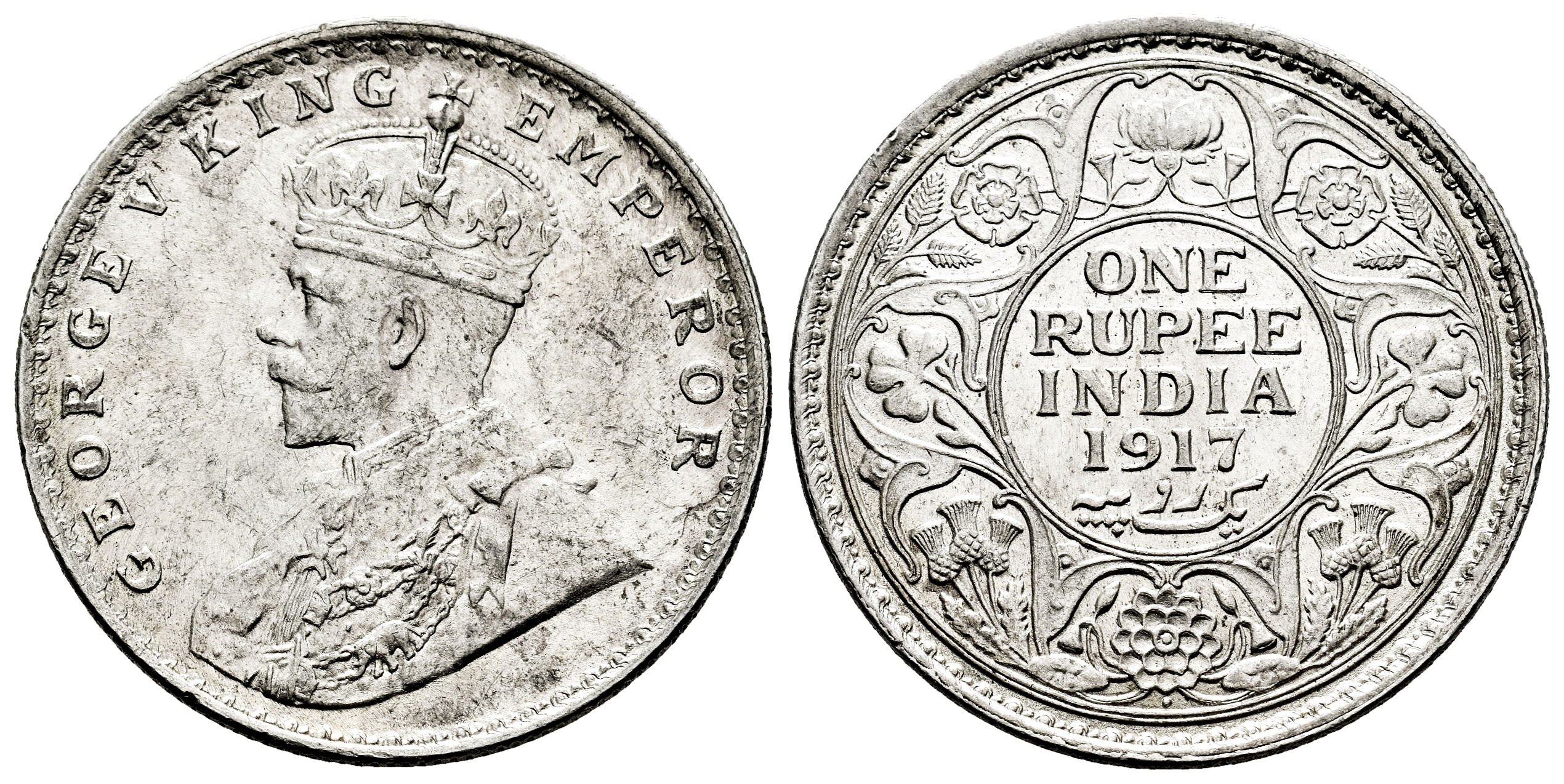British India. George V. 1 rupee. 1917. Bombay. (Km-524). Ag. 11,69 g. Traces of luster. XF/AU. Est...75,00.