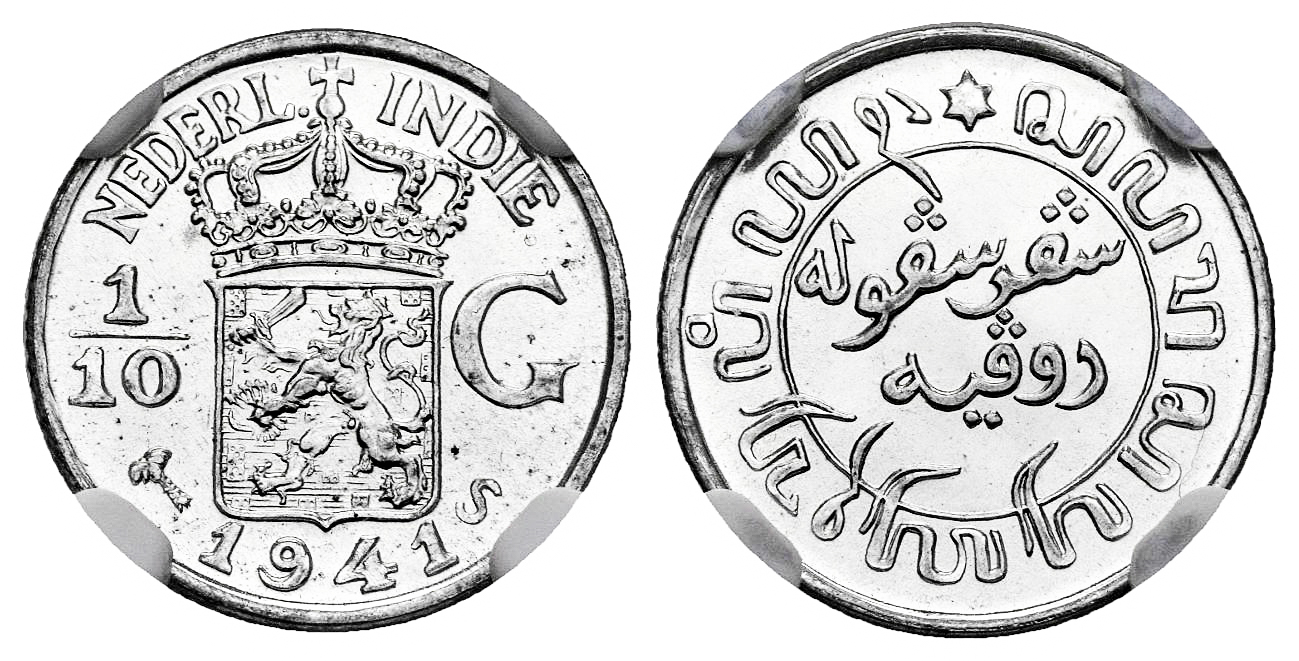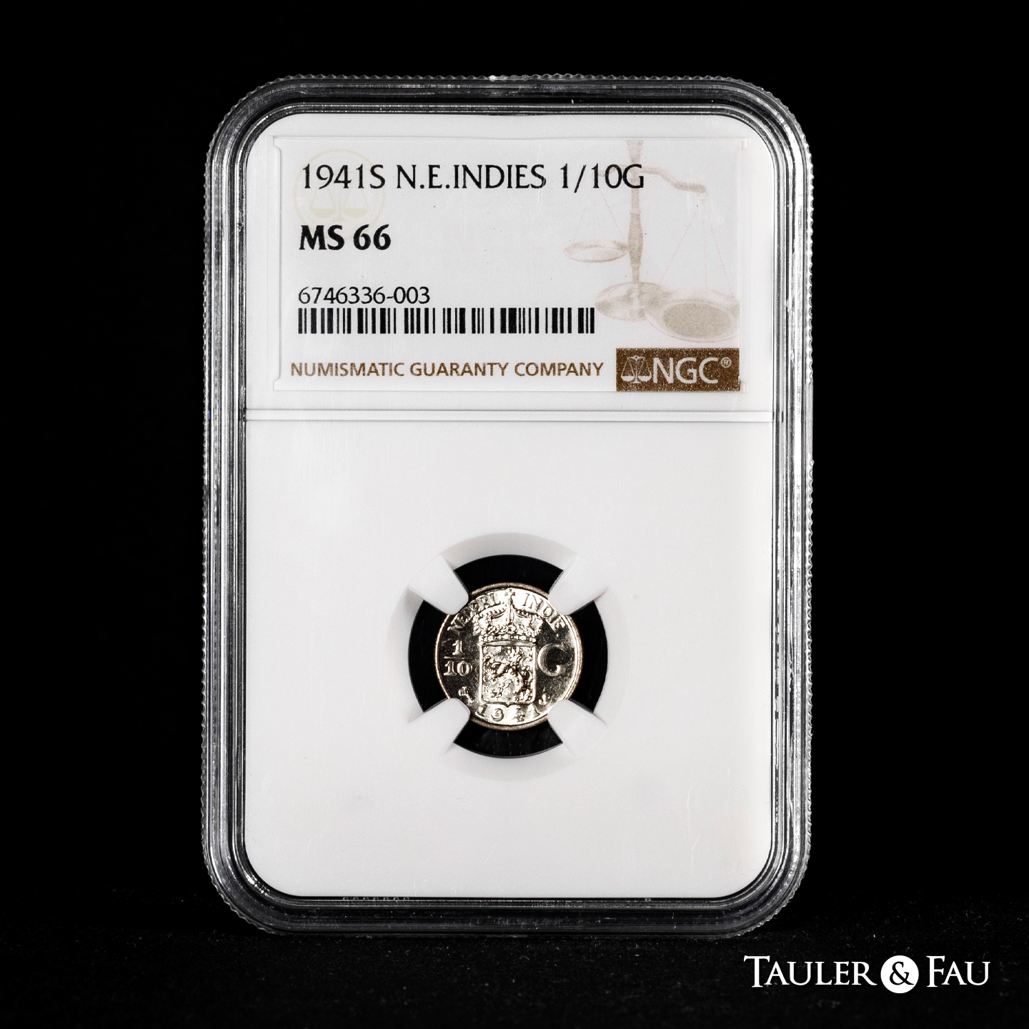 Dutch India. Wilhemina I (1890-1948). 1/10 gulden. 1941. San Francisco. S. (Km-318). (Schön-15). Ag. Plenty of original luster. Slabbed by NGC as MS 66. Only 2 finer specimens in the NGC census. Est...75,00.