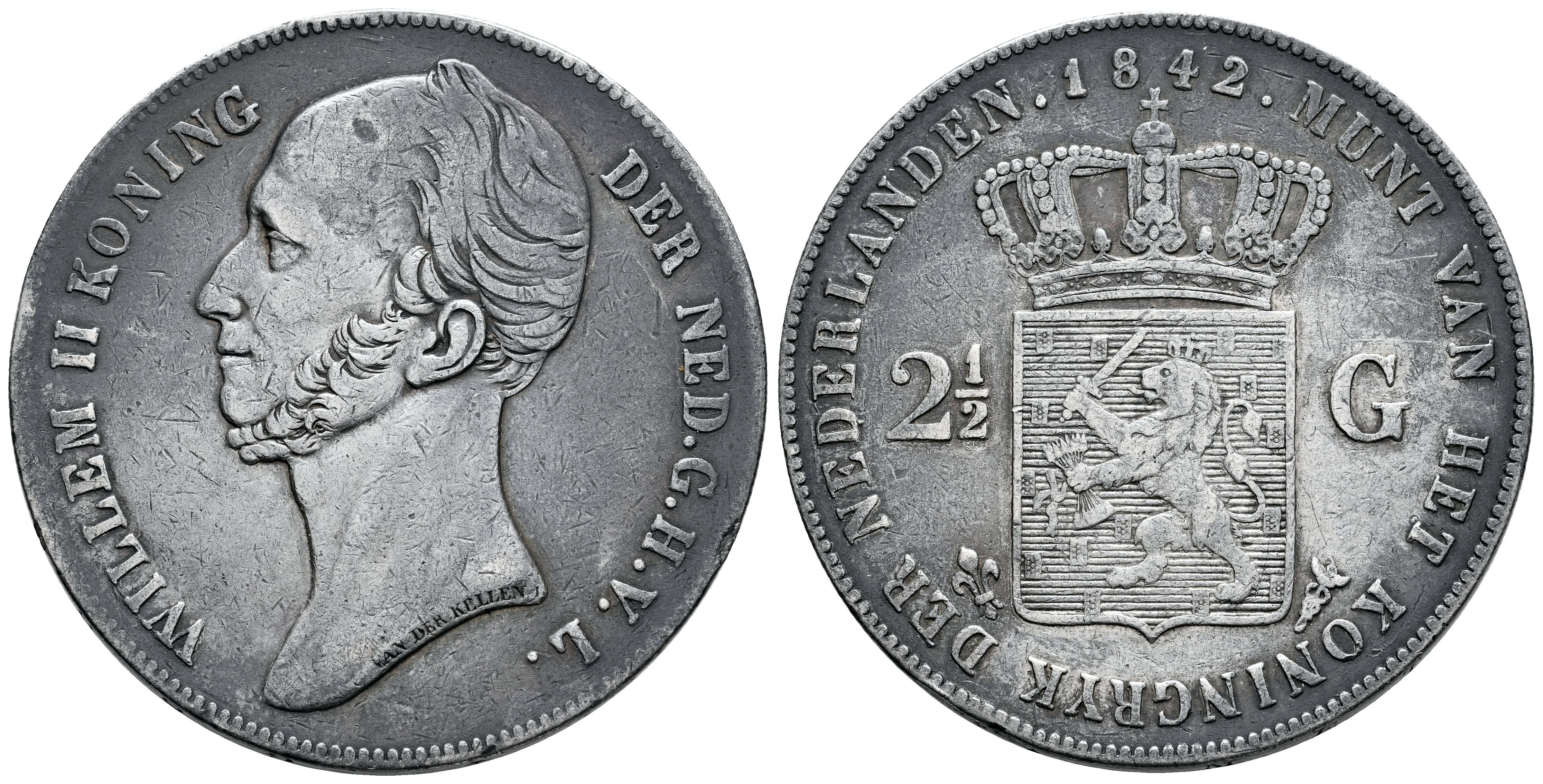 Low Countries. Wilhelm II. 2 1/2 gulden. 1842. (Km-69.1). (Dav-235). Ag. 24,69 g. Minor nicks on edge. Cleaned. VF. Est...45,00.
