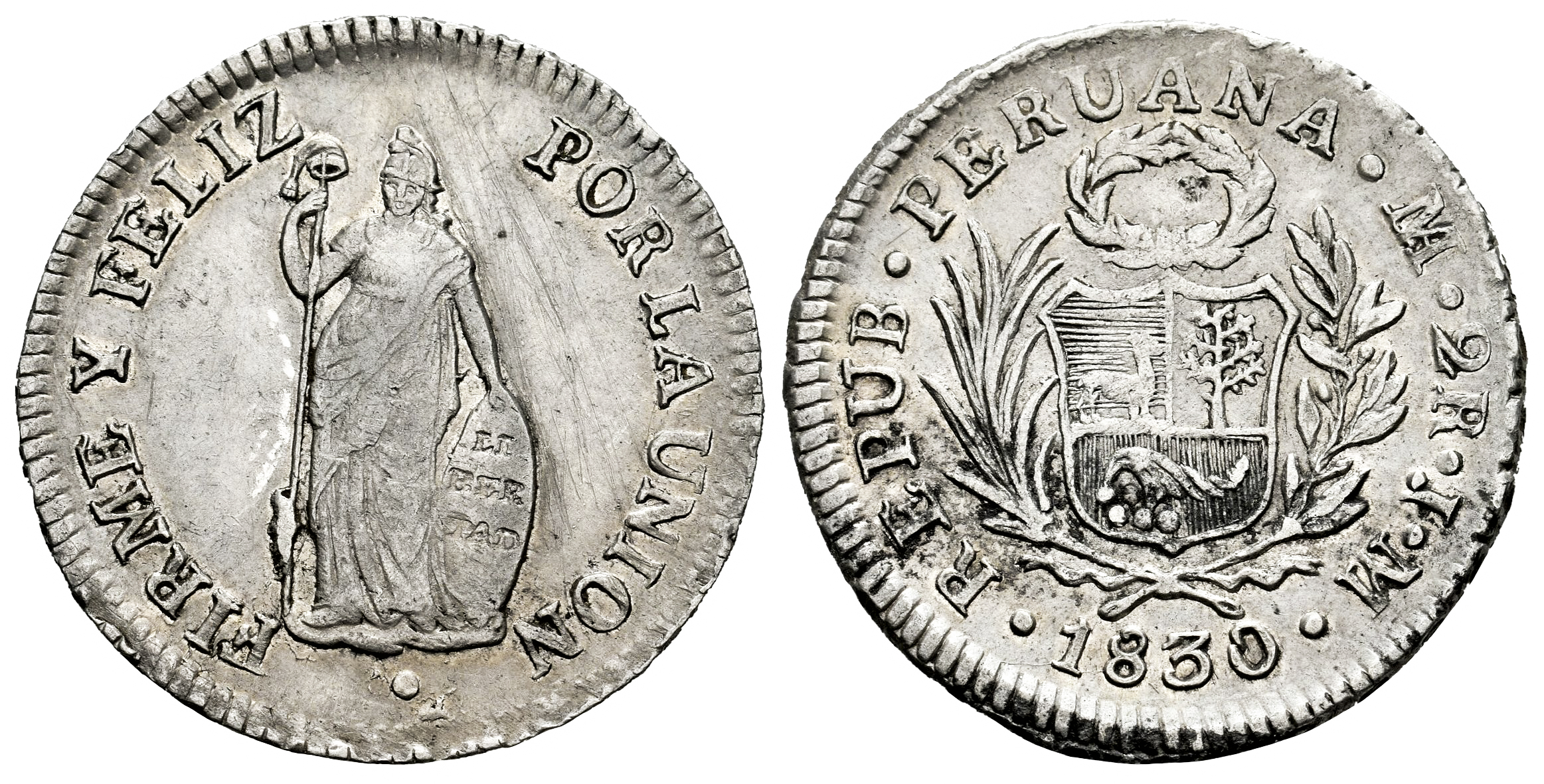 Peru. 2 reales. 1830. Lima. JM. (Km-141.1). Ag. 7,02 g. Hairlines. Traces of luster. Scarce. Choice VF. Est...100,00.