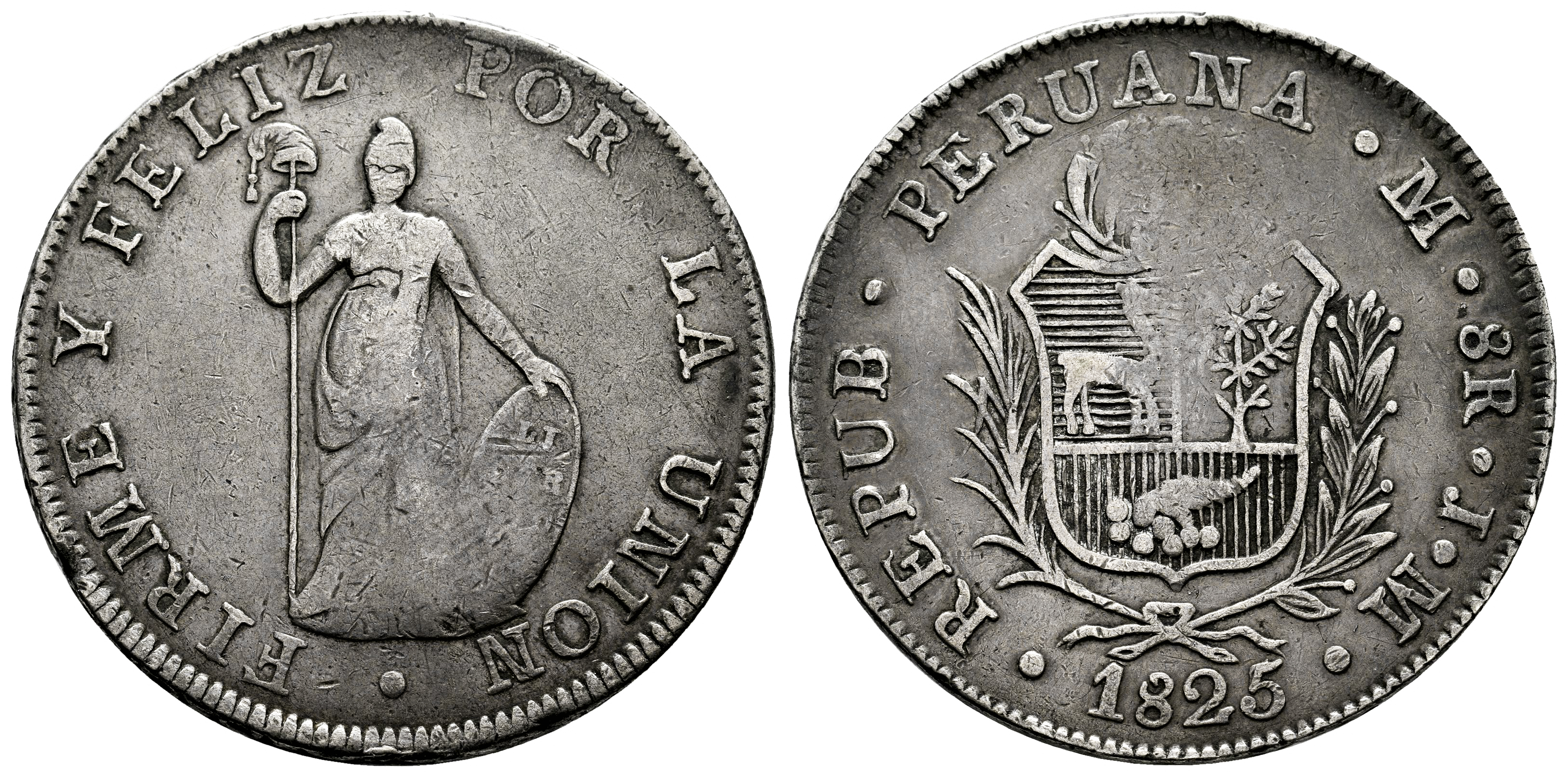 Peru. 8 reales. 1825. Lima. JM. (Km-142.1). Ag. 26,89 g. Minor nick on edge. Patina. Scarce. VF. Est...150,00.