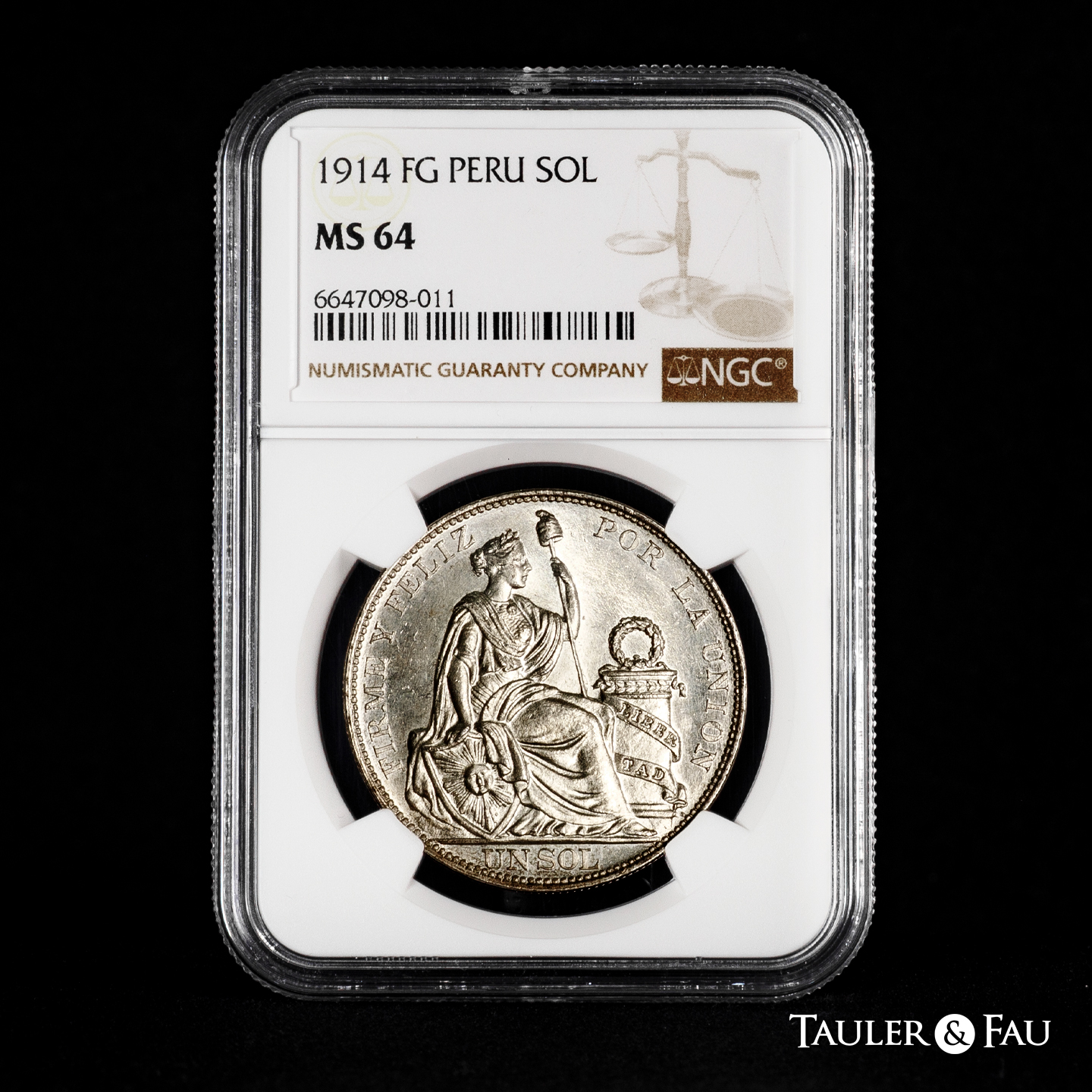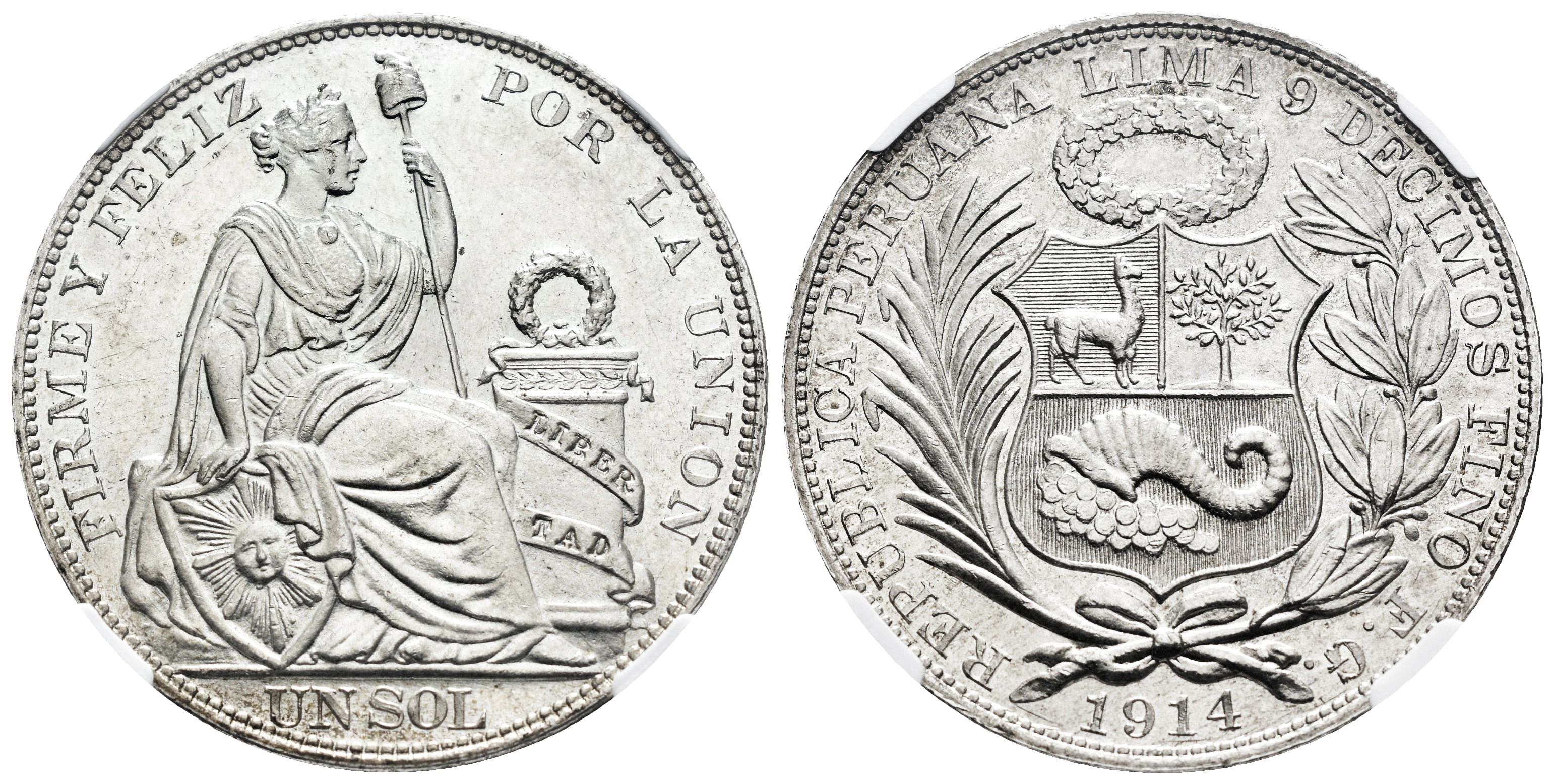 Peru. 1 sol. 1914. Lima. FG. (Km-196.26). Ag. Slabbed by NGC as MS 64. Plenty of original luster. Est...110,00.