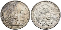 Peru. 1 sol. 1916. Lima. FG. (Km-196.27). Ag. 25,02 g. Obverse tone. Original luster on reverse. AU. Est...60,00.