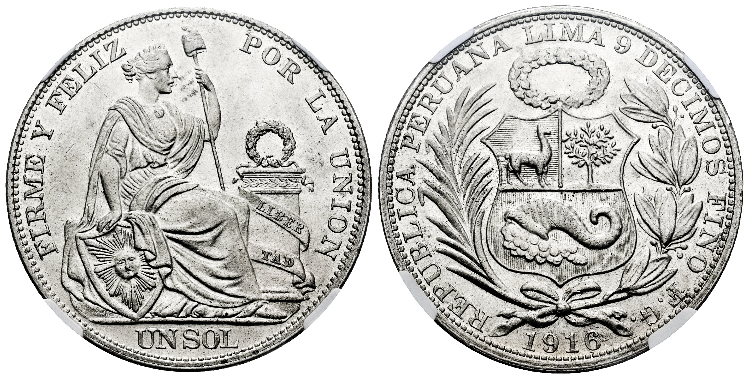 Peru. 1 sol. 1916. Lima. FG. (Km-196.26). Ag. Full luster. Attractive. Slabbed by NGC as MS 62. "LIBERTAD" Raised. Est...120,00.