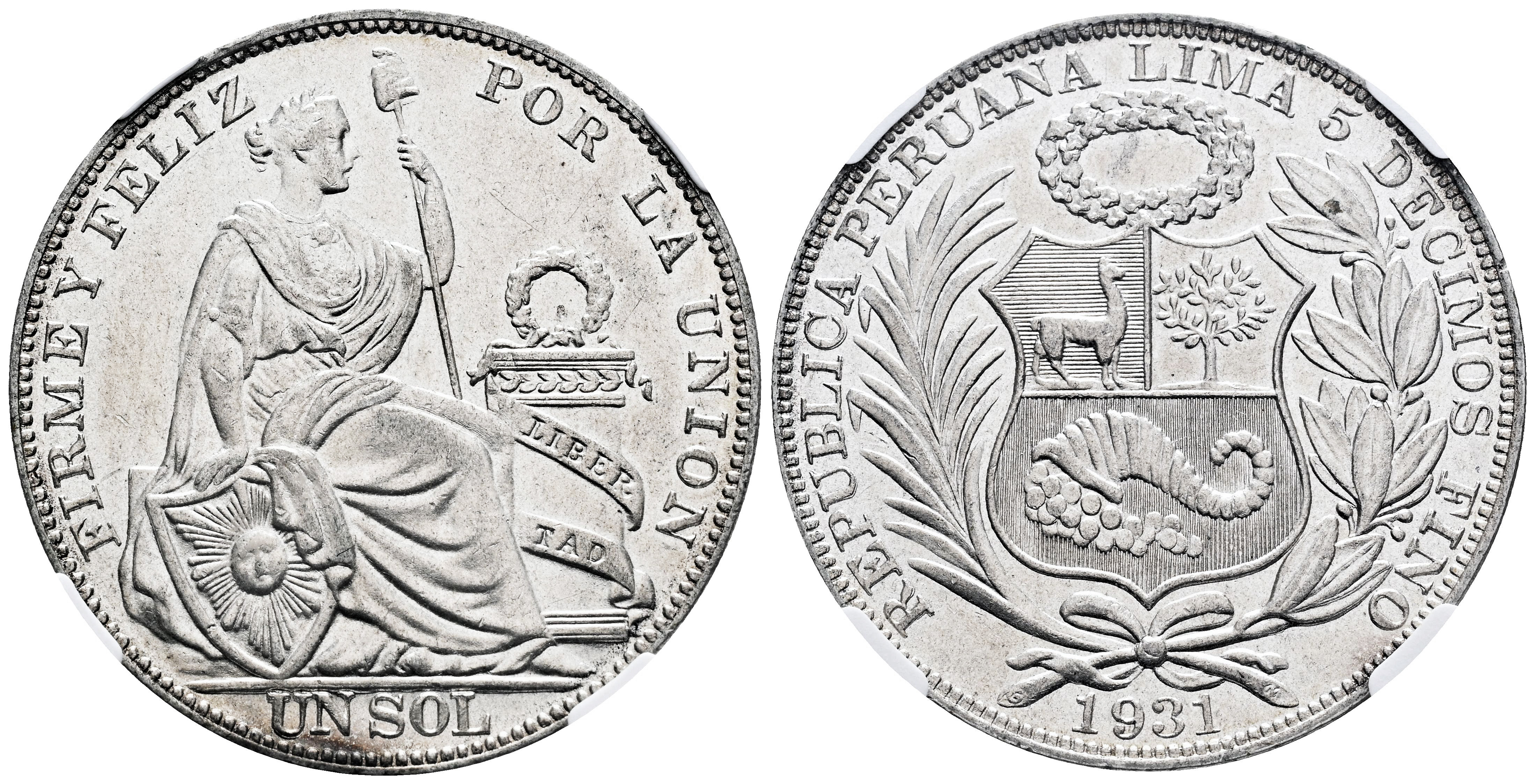 Peru. 1 sol. 1931. (Km-218). Ag. Slabbed by NGC as AU 58. Est...70,00.